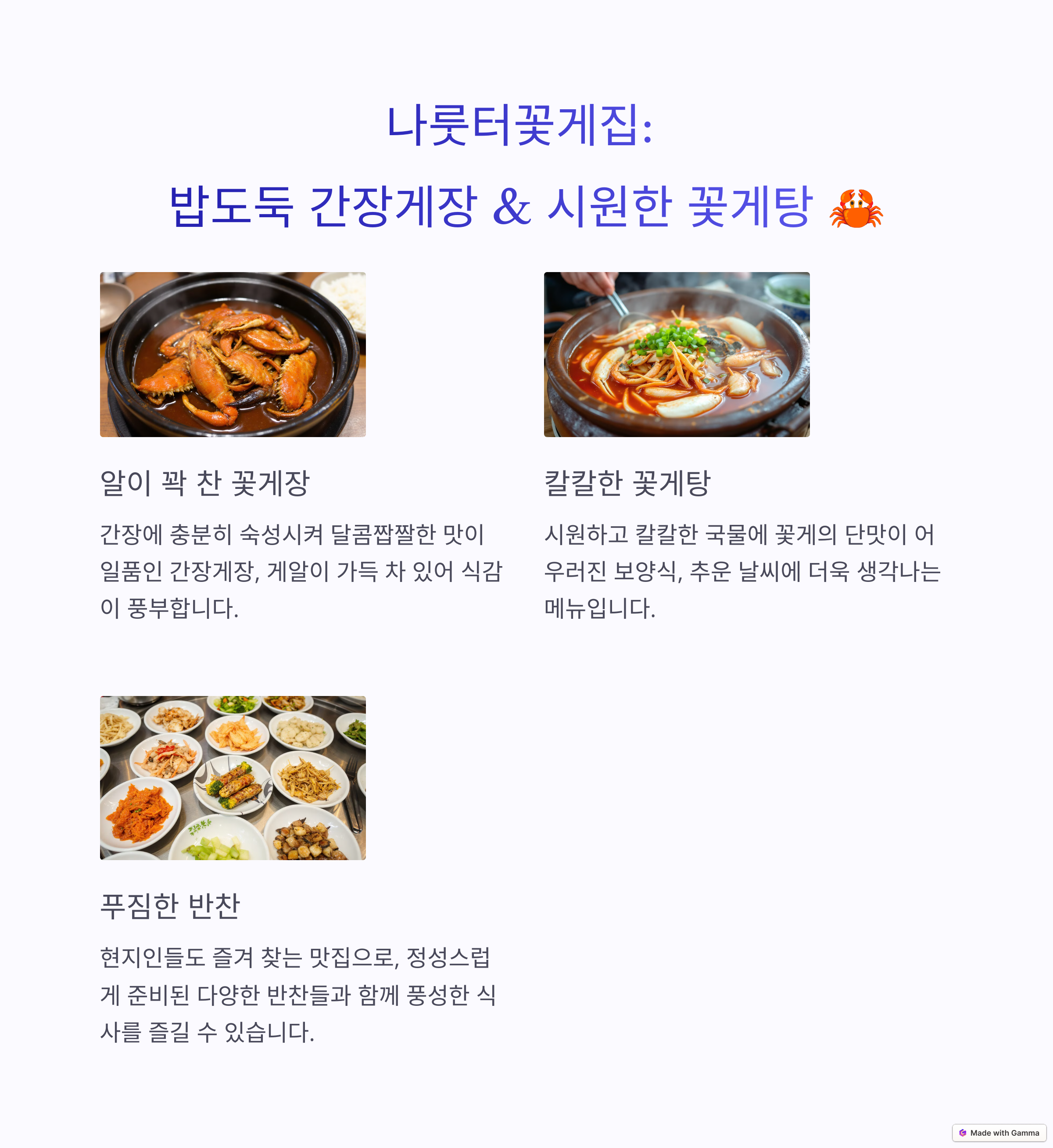 - 특징: 꽃게탕과 간장게장이 대표 메뉴이며, 꽃게 요리를 좋아하는 사람들에게 강력 추천됩니다