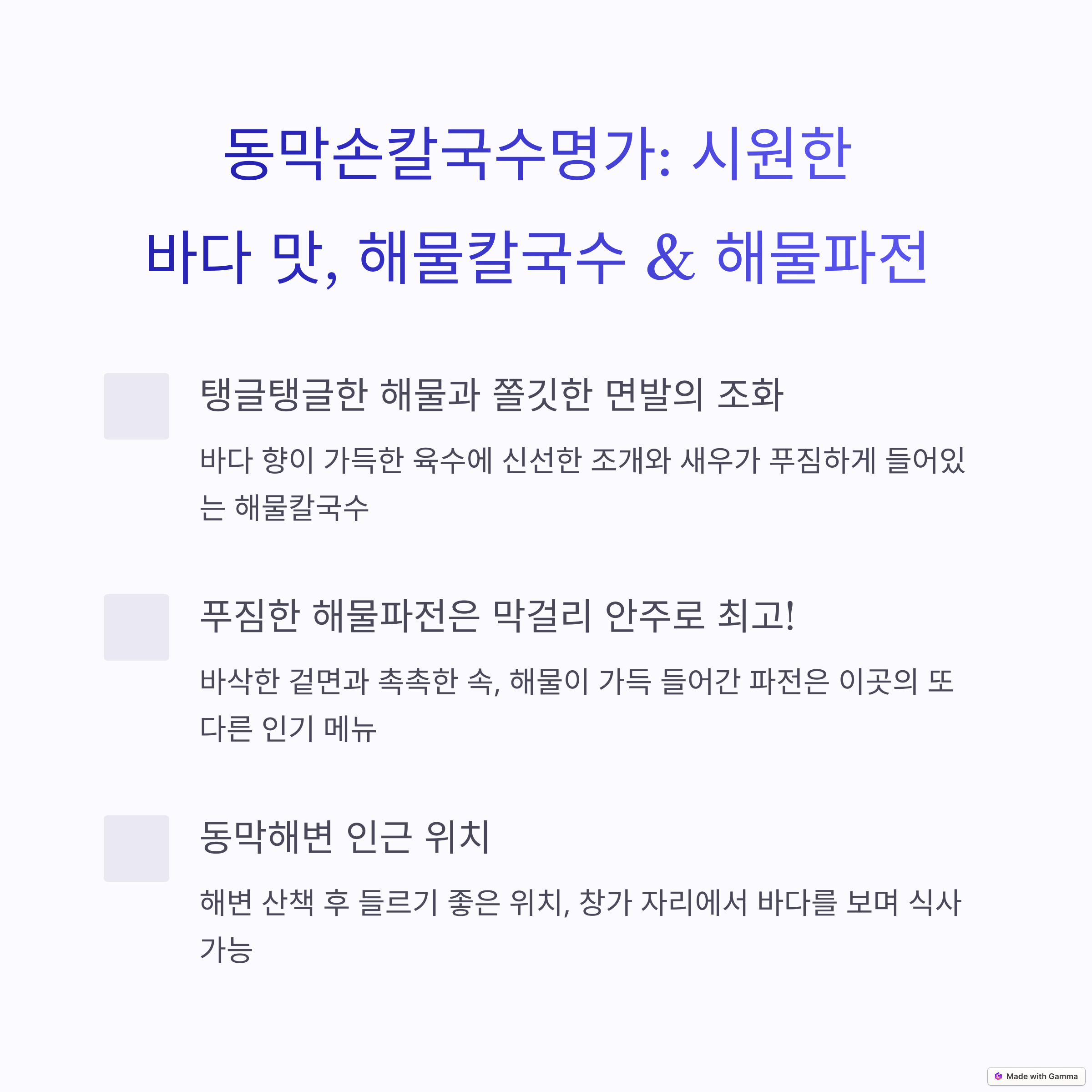 - 특징: 해물 가득한 칼국수와 해물파전이 인기 메뉴입니다. 동막해수욕장 근처에 위치해 접근성이 좋으며, 국물의 깊은 풍미와 쫄깃한 면발이 매력적입니다