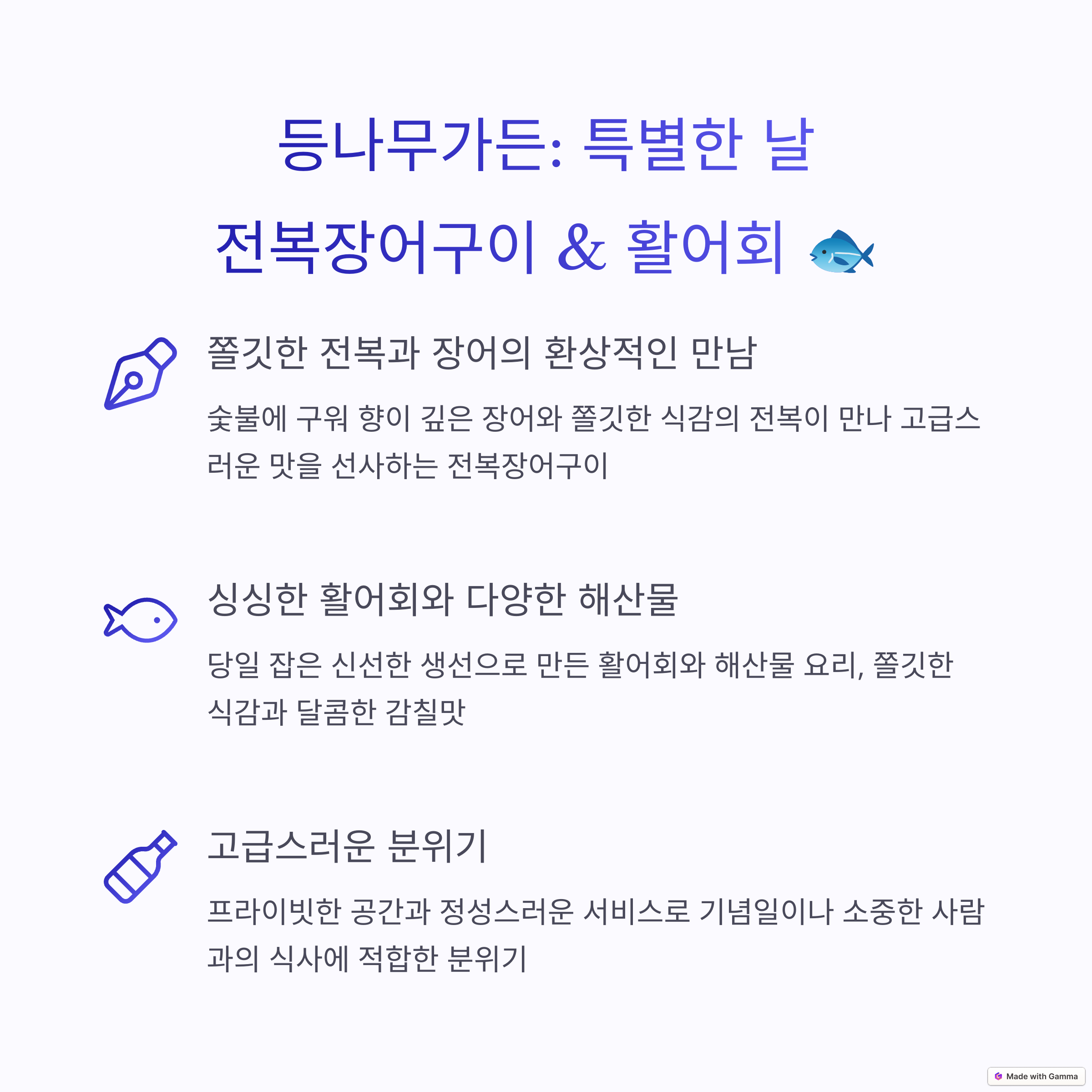 - 특징: 해물탕과 해물찜이 인기 있으며, 신선한 재료를 사용해 깊은 풍미를 자랑합니다. 예약 가능하며 조용한 분위기에서 식사할 수 있습니다