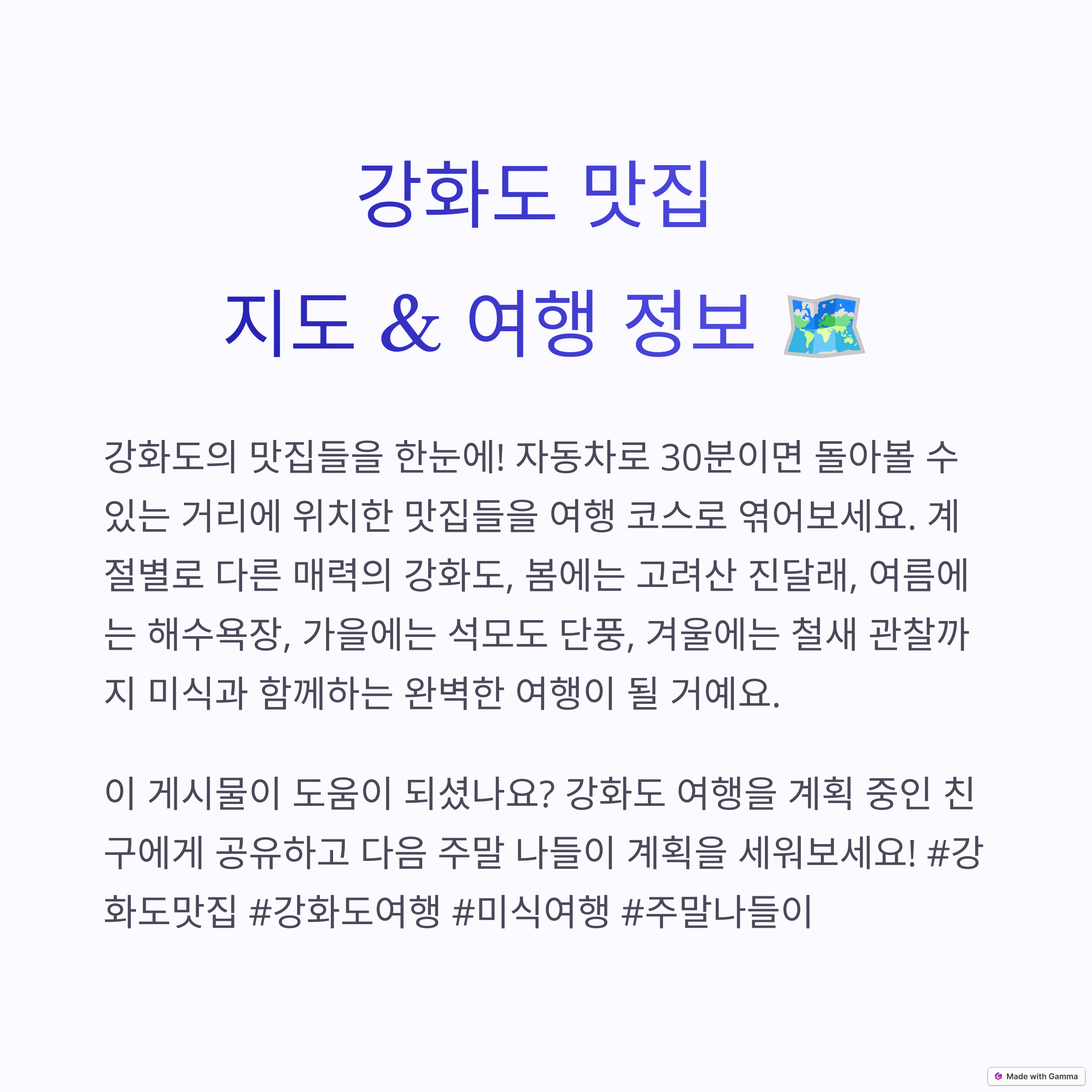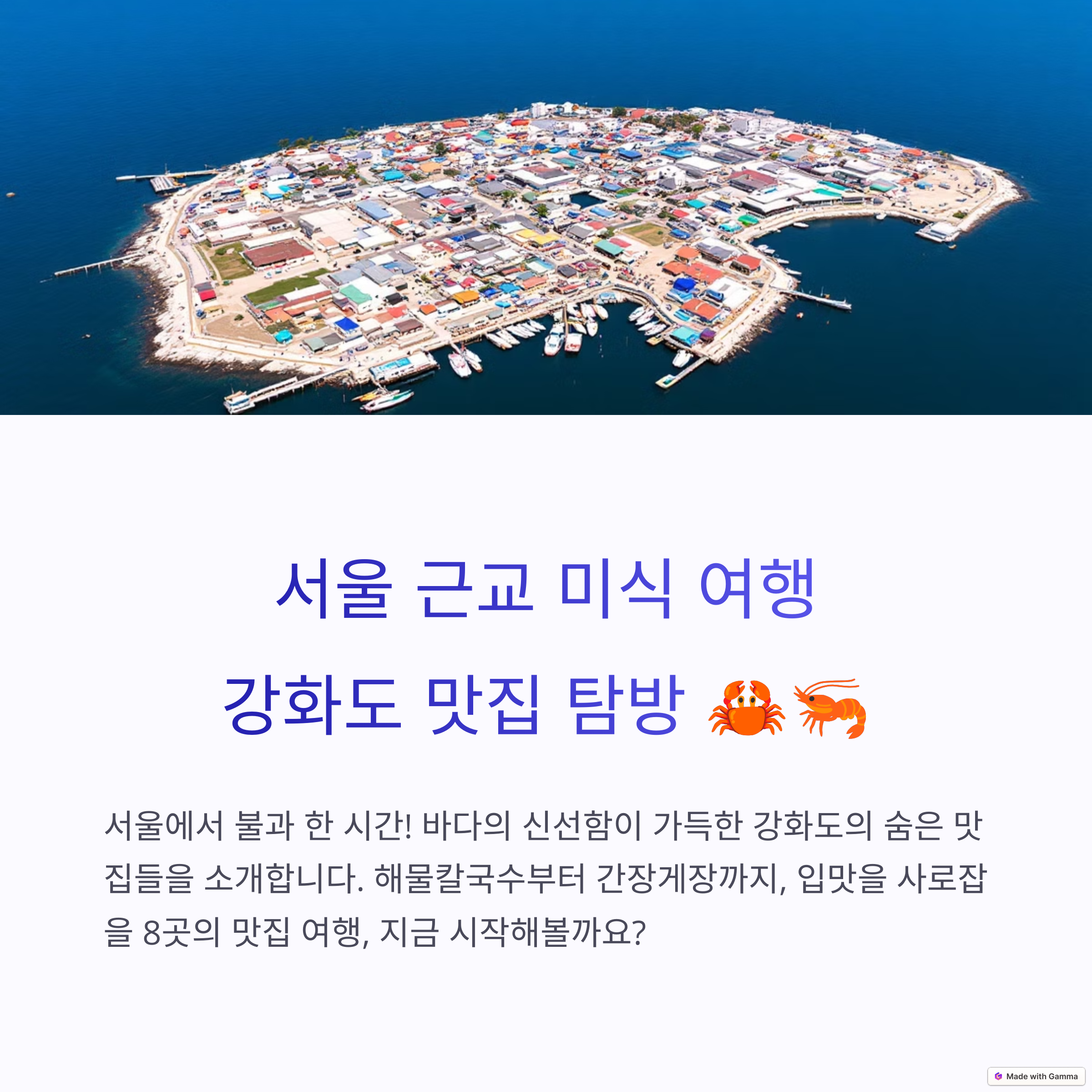 강화도는 서울에서 가까운 서해안 여행지로, 아름다운 바다 전망과 다양한 맛집, 카페들로 유명합니다. 특히 당일치기 여행을 계획하는 사람들에게 최적의 장소로 손꼽히며, 힐링과 미식을 동