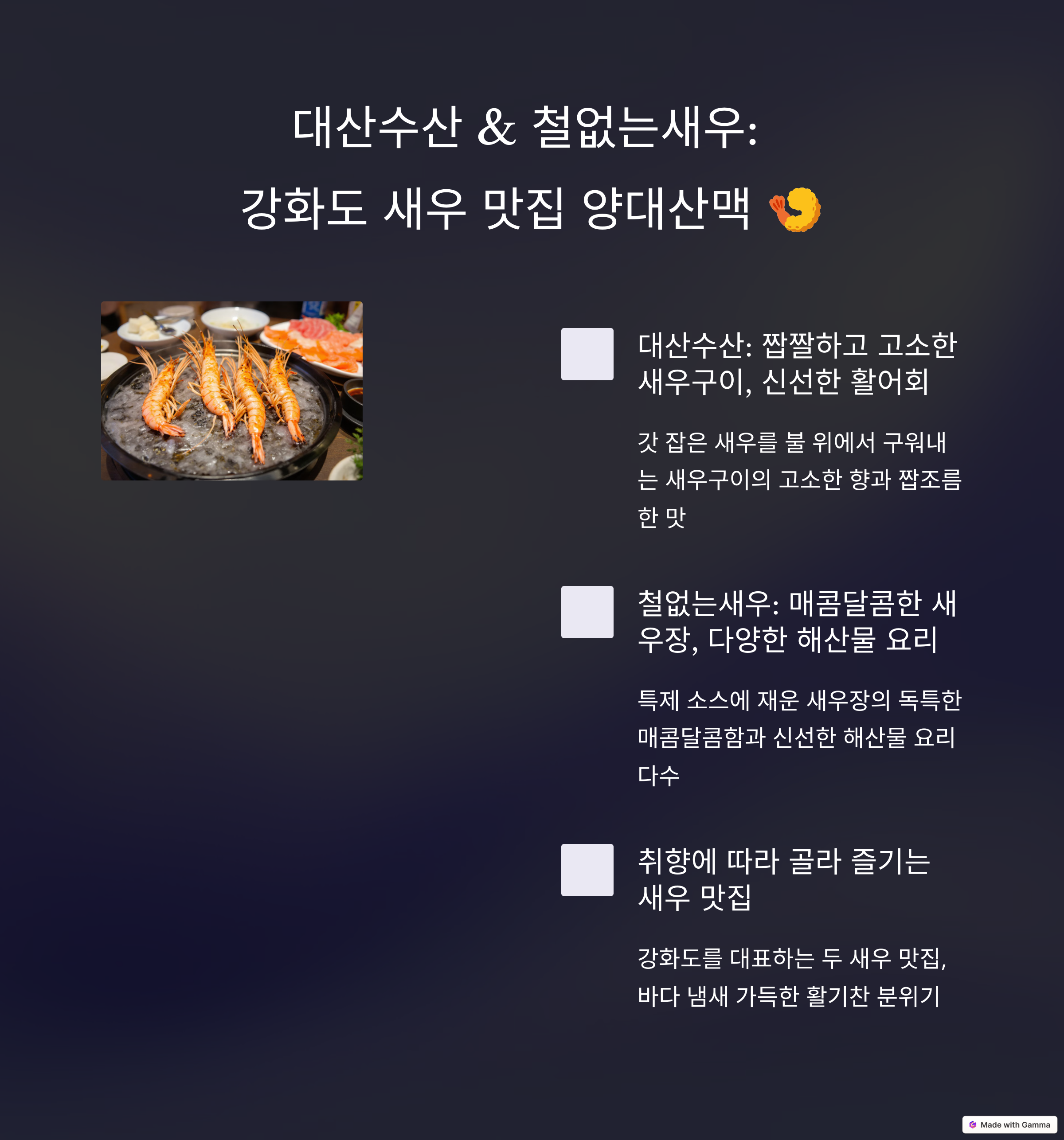 - 특징: 신선한 새우 요리가 유명하며, 새우회, 버터구이 등 다양한 요리를 제공합니다. 매장 내 주차 가능하며 공영주차장도 가까워 편리합니다