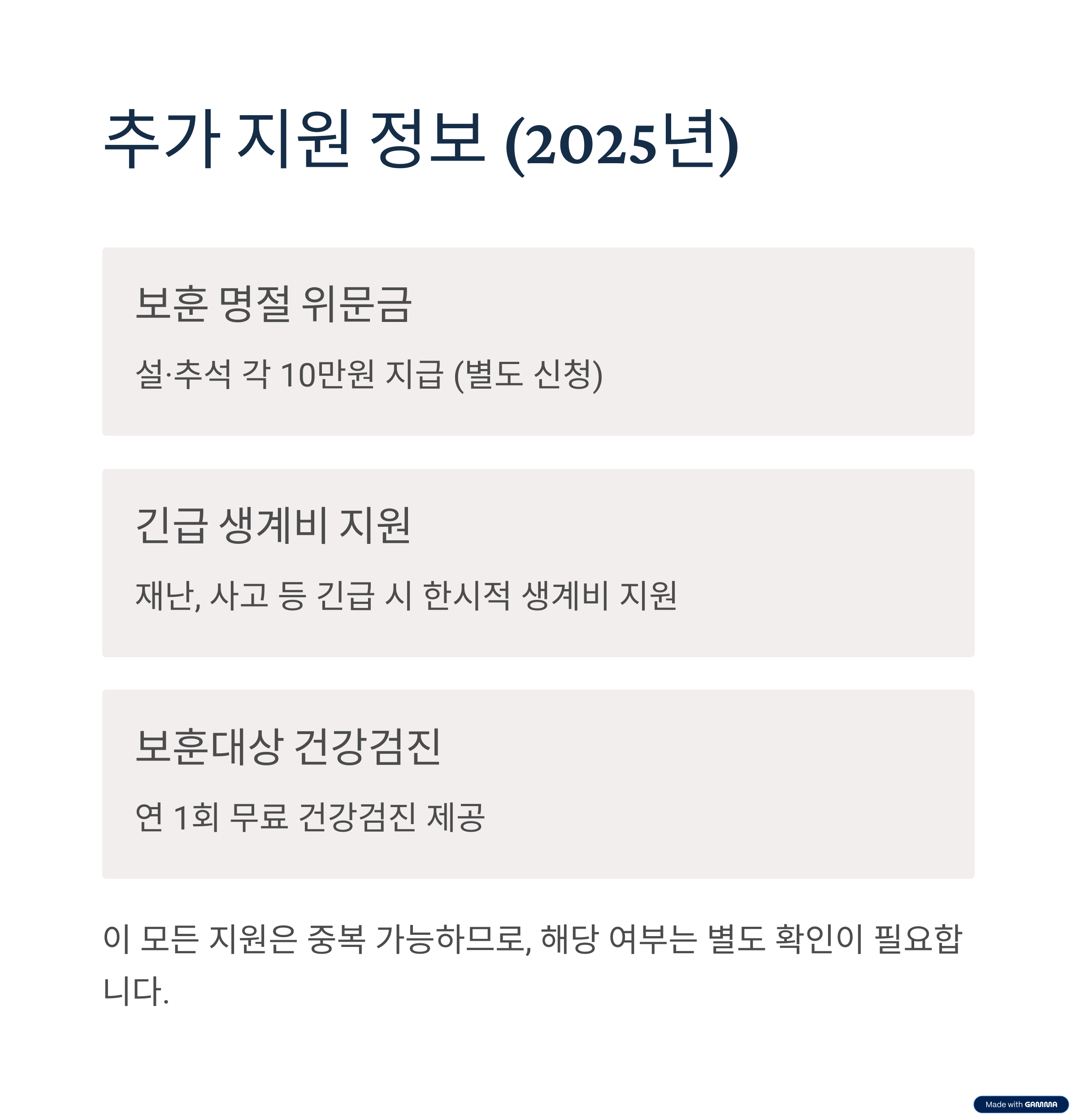 | 보훈대상 건강검진 | 연 1회 무료 건강검진 제공 (지정 병원 안내 필요) |