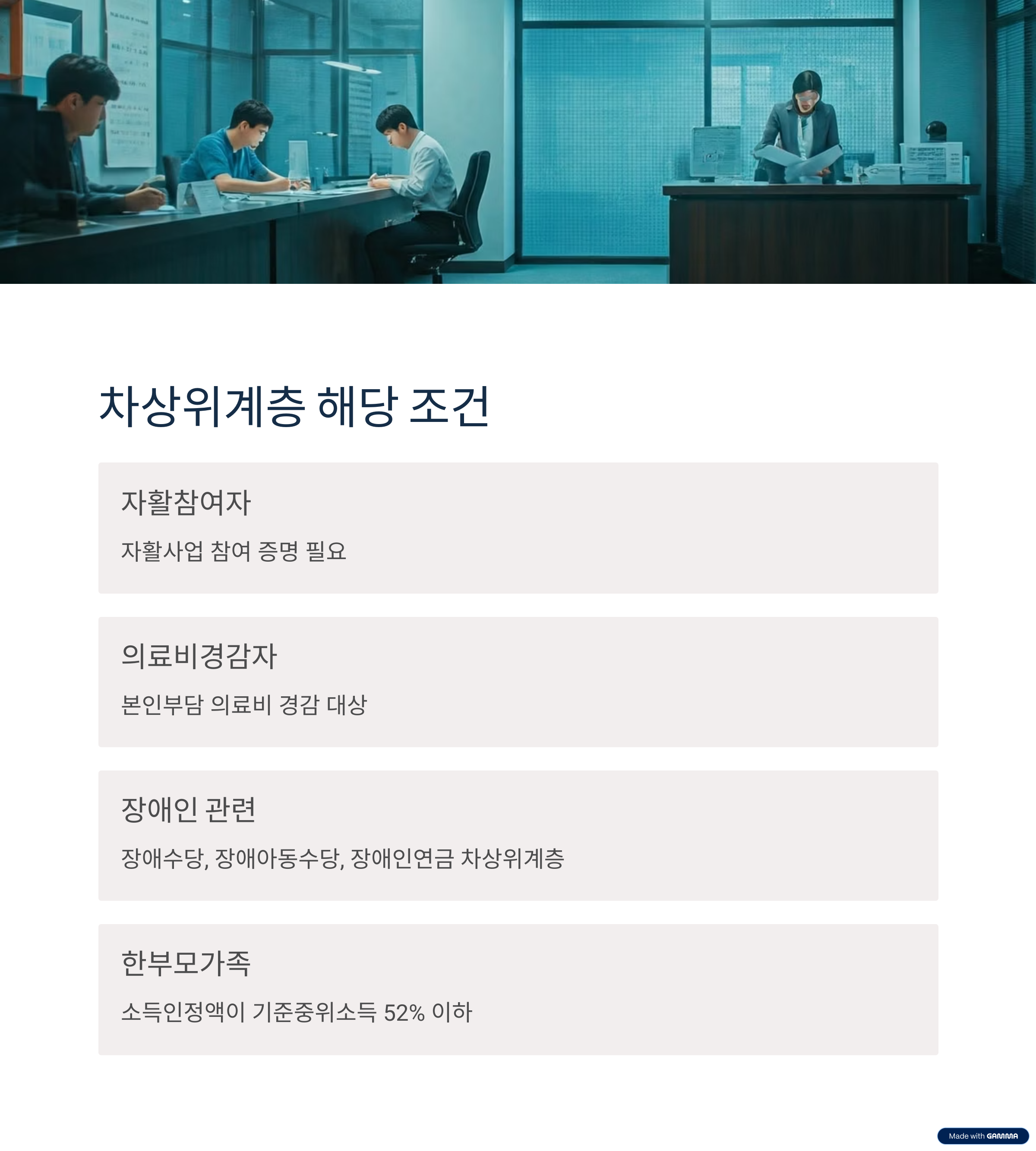 중요: 소득조사 및 부양가족 기준은 보건복지부 차상위계층 기준을 따릅니다.