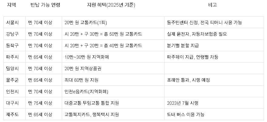 - 대중교통 지원: 대구, 제주 등 일부 광역시는 무임교통, 행복택시 등 교통복지 정책 병행