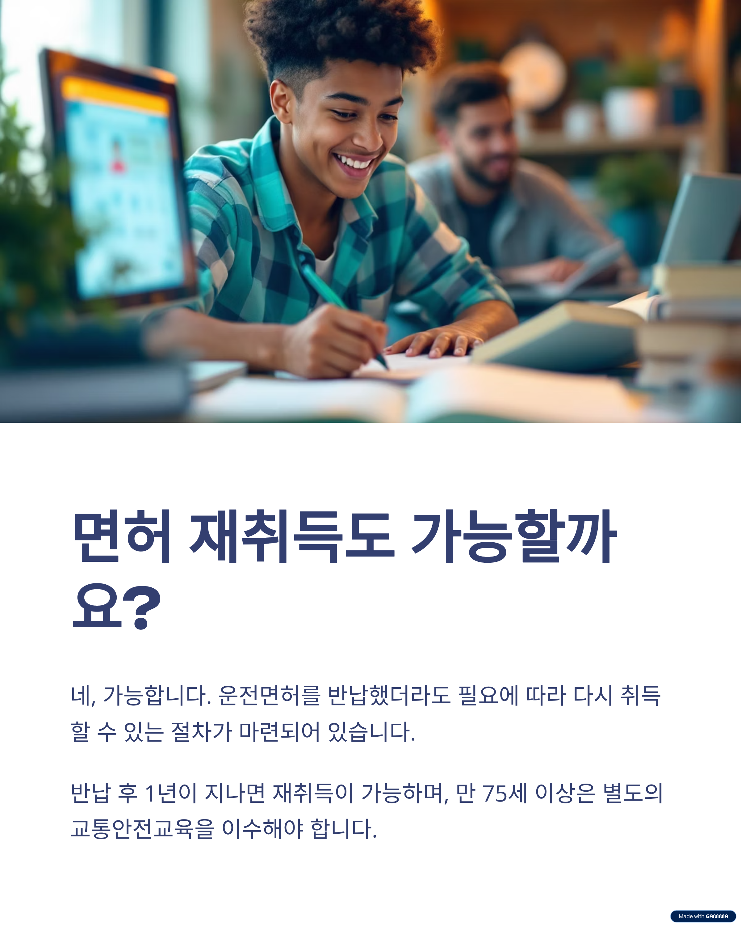 - 면허 재취득: 반납 후 1년 경과 시 재취득 가능, 75세 이상은 교통안전교육 이수 필요