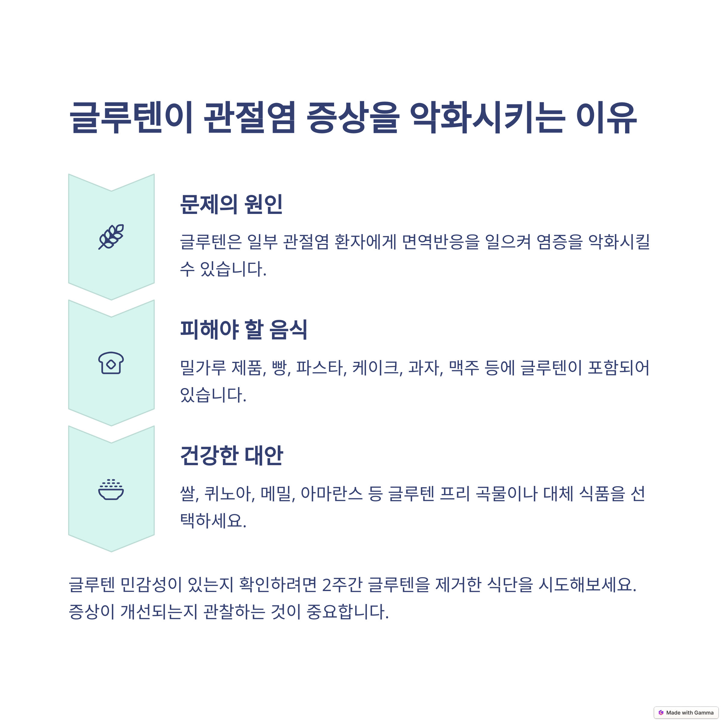 과학적 근거: 글루텐은 일부 사람들에게 염증을 유발할 수 있으며, 이는 관절염 증상을 악화시킬 수 있습니다. 그러나 모든 관절염 환자에게 글루텐이 문제가 되는 것은 아닙니다.
