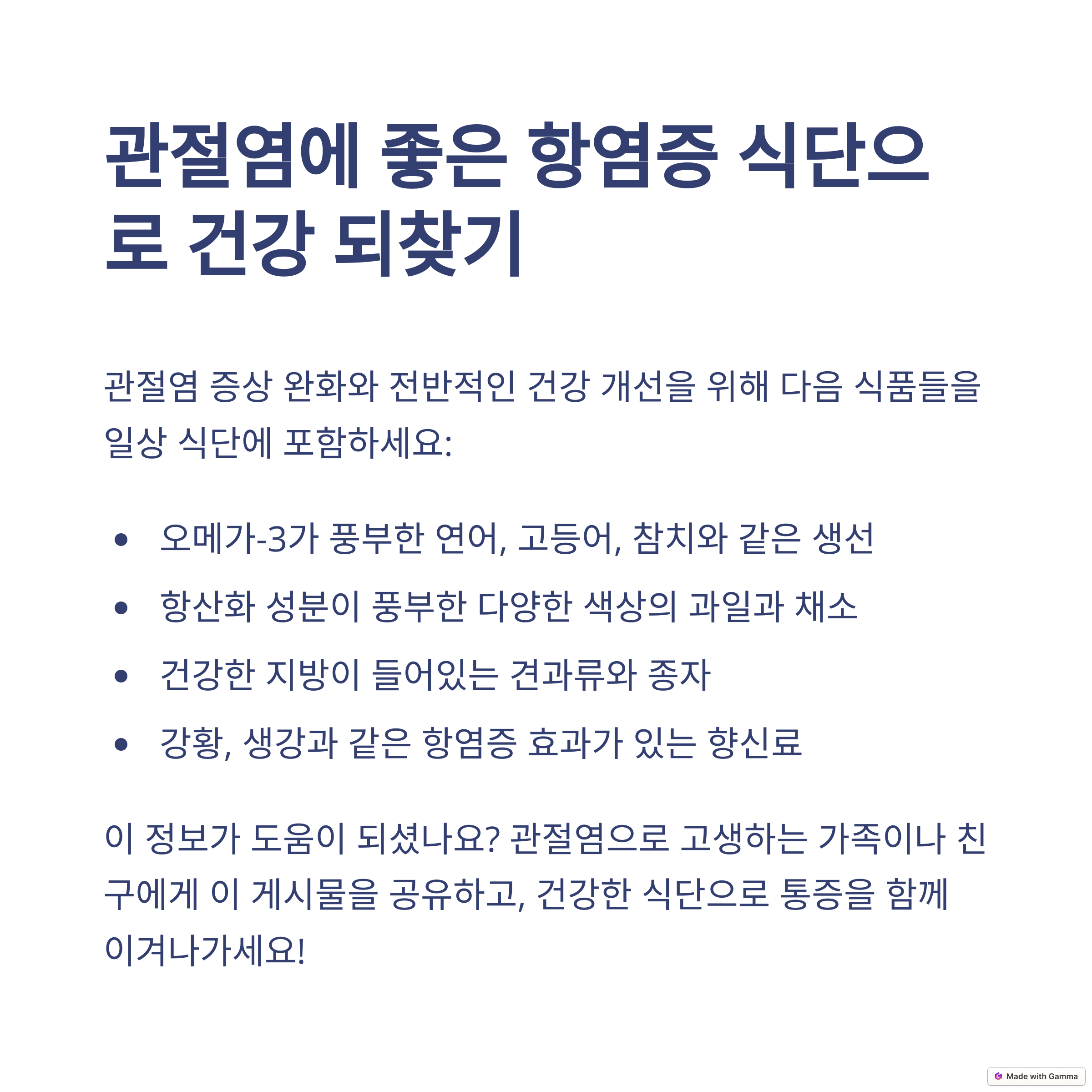 - 채식 식단: 염증을 줄이고 관절염 증상을 완화하는 데 도움이 될 수 있습니다.