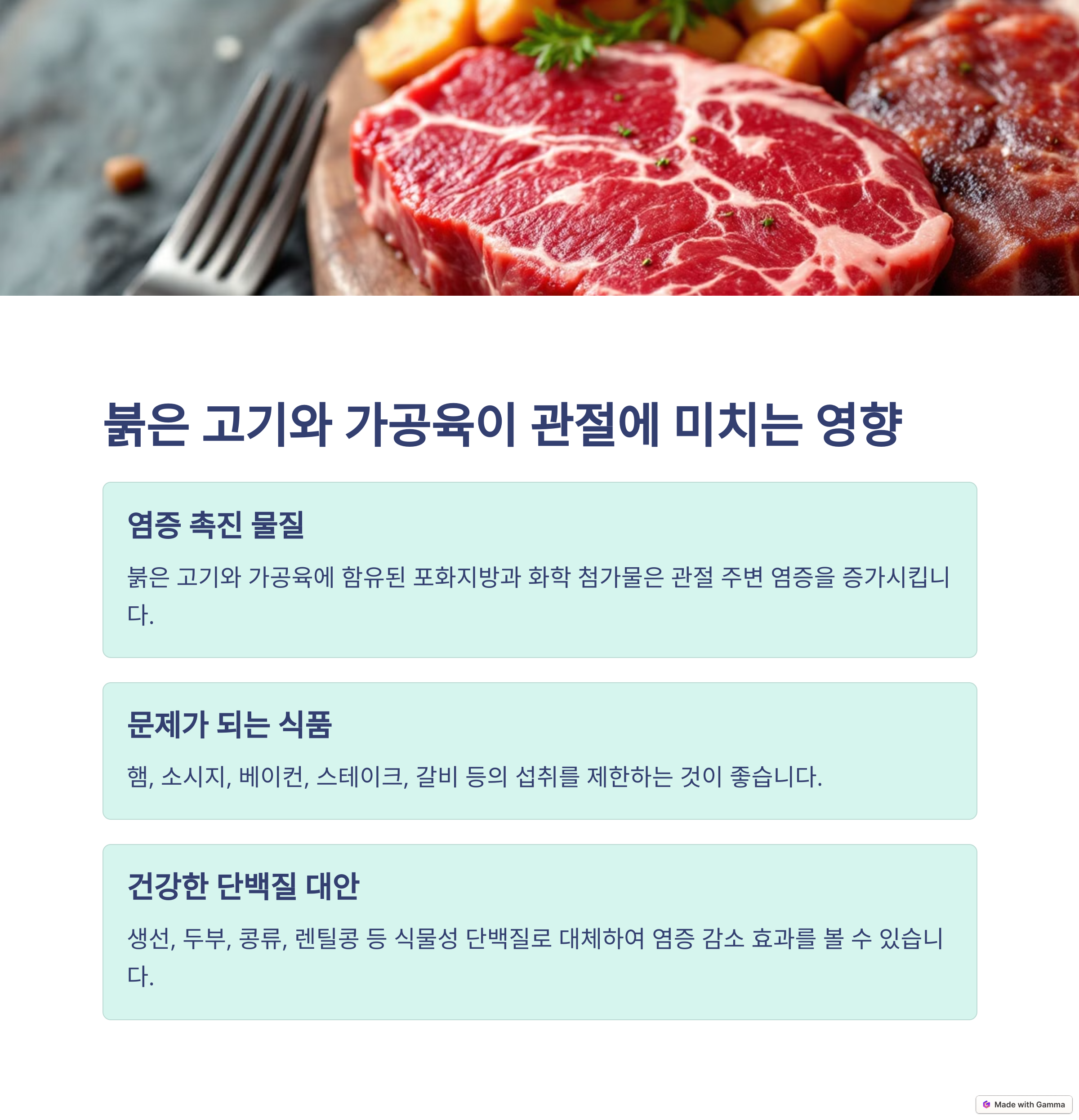 과학적 근거: 처리된 고기와 붉은 고기는 염증을 유발할 수 있으며, 이는 관절염 증상을 악화시킬 수 있습니다. 예를 들어, 소시지, 베이컨, 스테이크 등은 염증을 증가시킬 수 있는 성분을 포함하고 있습니다.