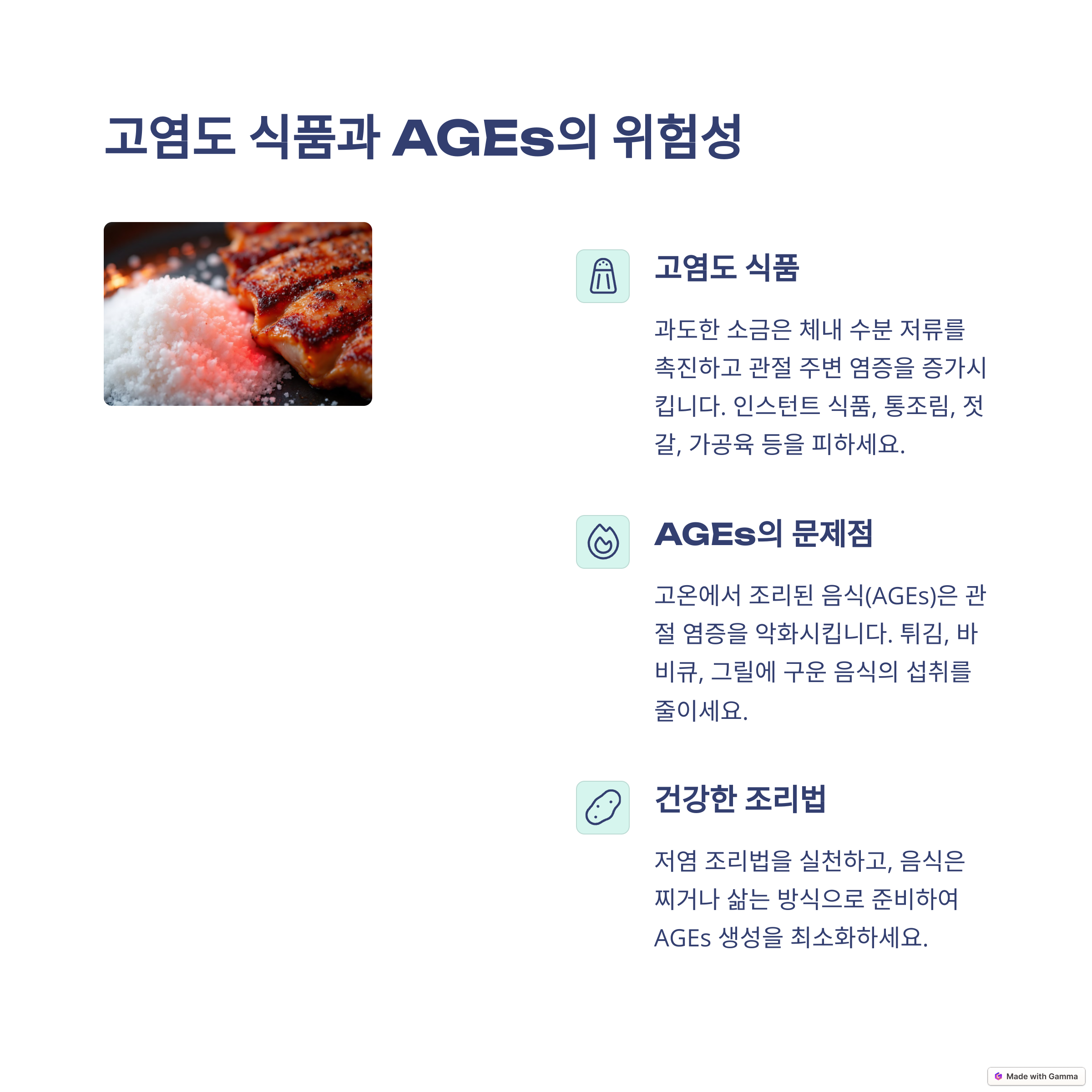 과학적 근거: AGEs는 고온에서 조리된 동물성 식품에 많이 포함되어 있으며, 이는 염증을 유발하고 관절염 증상을 악화시킬 수 있습니다.