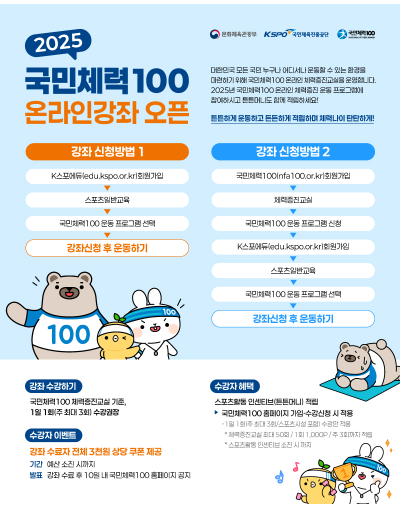 2025년, 대한민국 국민이라면 누구나 참여할 수 있는 체력증진 온라인 강좌인 ‘국민체력100 온라인강좌’가 오픈했습니다.