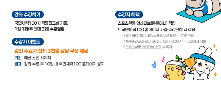 집에서 편하게 운동하며 체력도 높이고, 다양한 수강자 혜택도 챙길 수 있는 국민체력100 온라인강좌로 건강한 2025년을 만들어보세요.