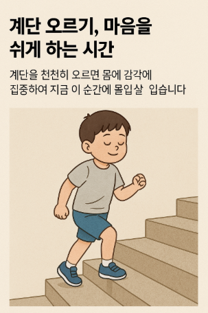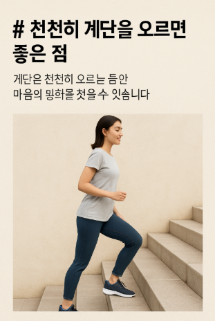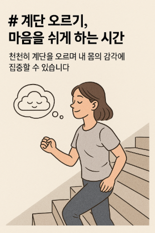 여러분도 오늘 한 번, 계단을 천천히 오르며 내 몸의 감각에 집중해보세요. 분명히 새로운 기분을 느낄 수 있을 거예요!