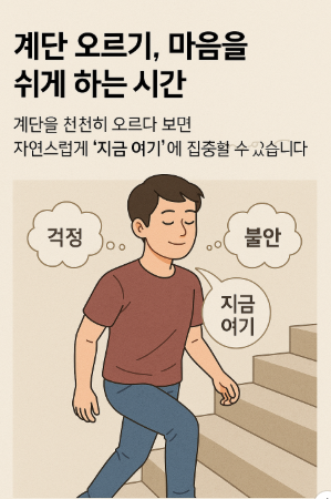 계단을 천천히 오르다 보면, 자연스럽게 내 몸의 움직임에 집중하게 됩니다. 발이 계단에 닿는 느낌, 무릎이 구부러지는 감각, 숨이 차오르는 것까지 하나하나 느끼게 되죠.