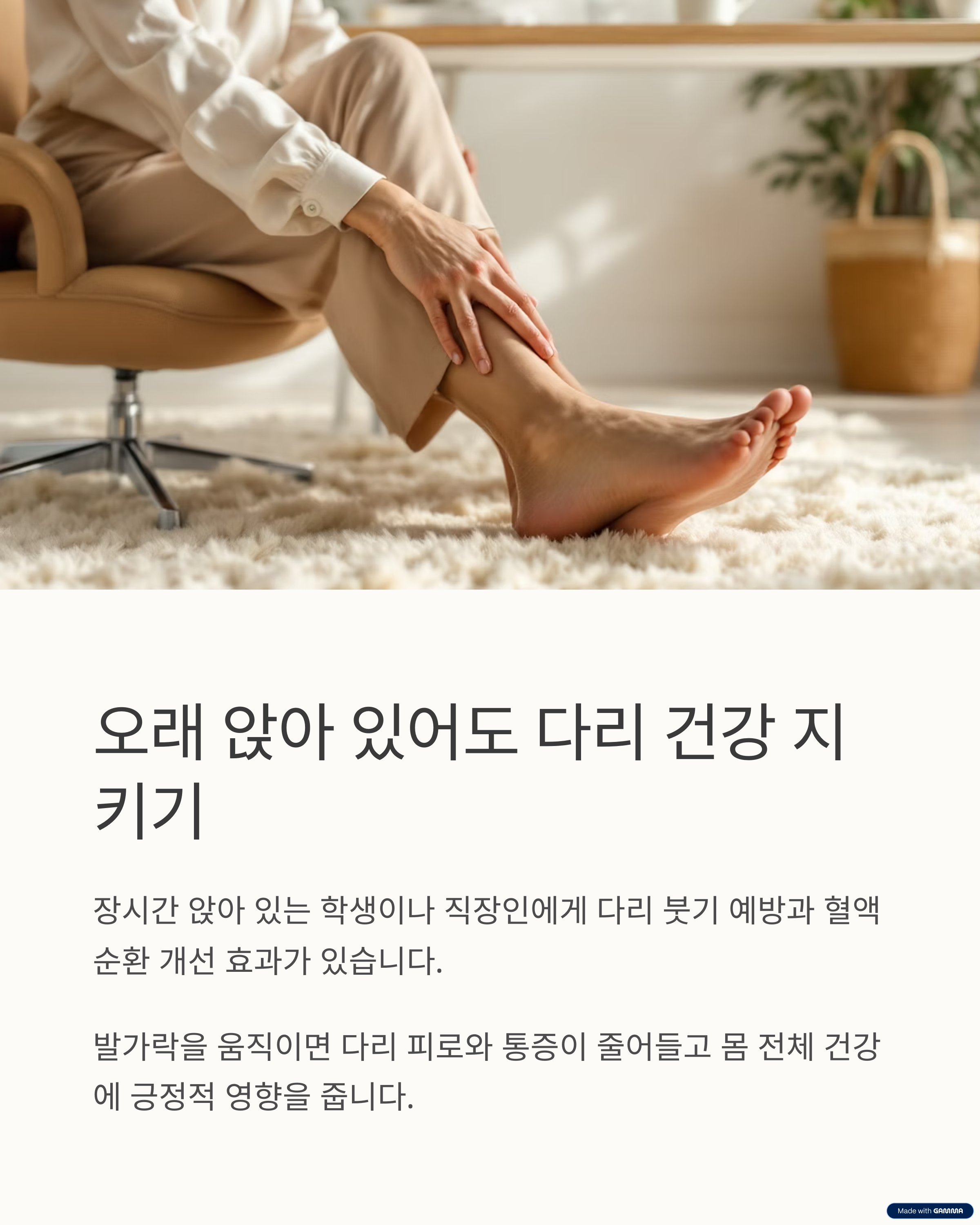 - 장시간 앉아 있는 학생이나 직장인에게 다리 붓기 예방과 혈액 순환 개선 효과가 있습니다.