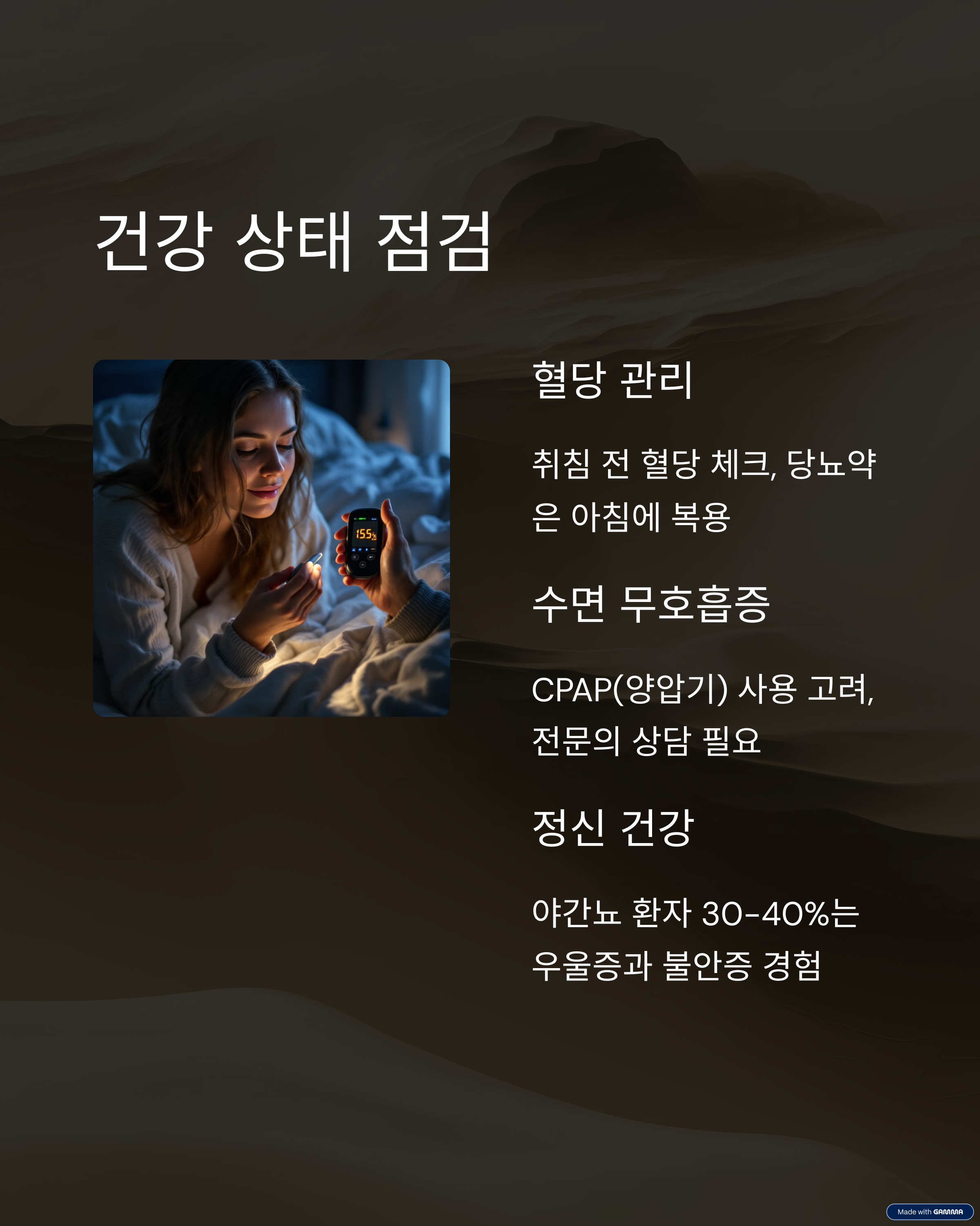 - 혈당이 높으면 소변량이 증가하므로, 취침 전 혈당 체크가 필요합니다.