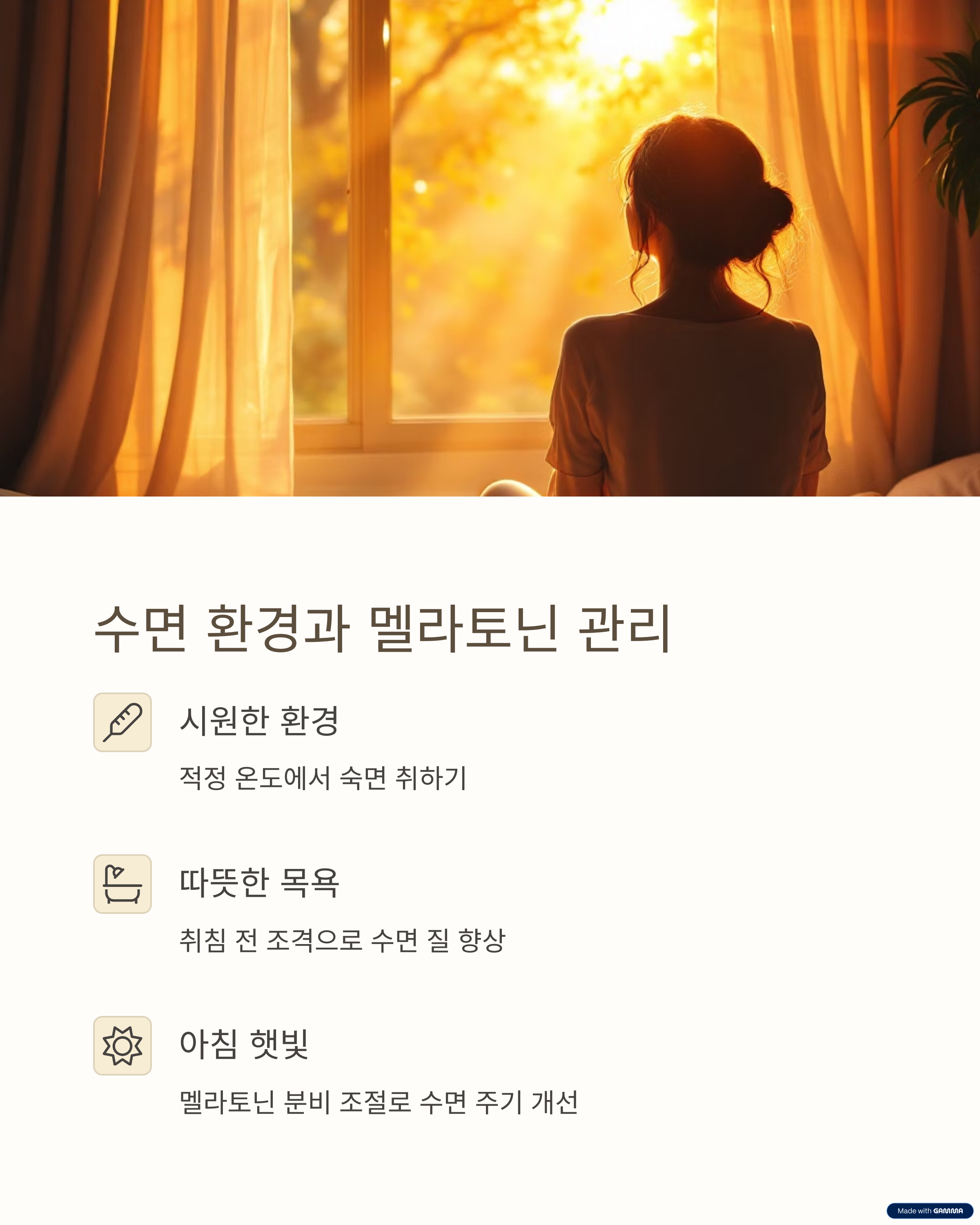- 관련 키워드: 수면 환경, 멜라토닌, 햇빛 노출, 조격, 숙면