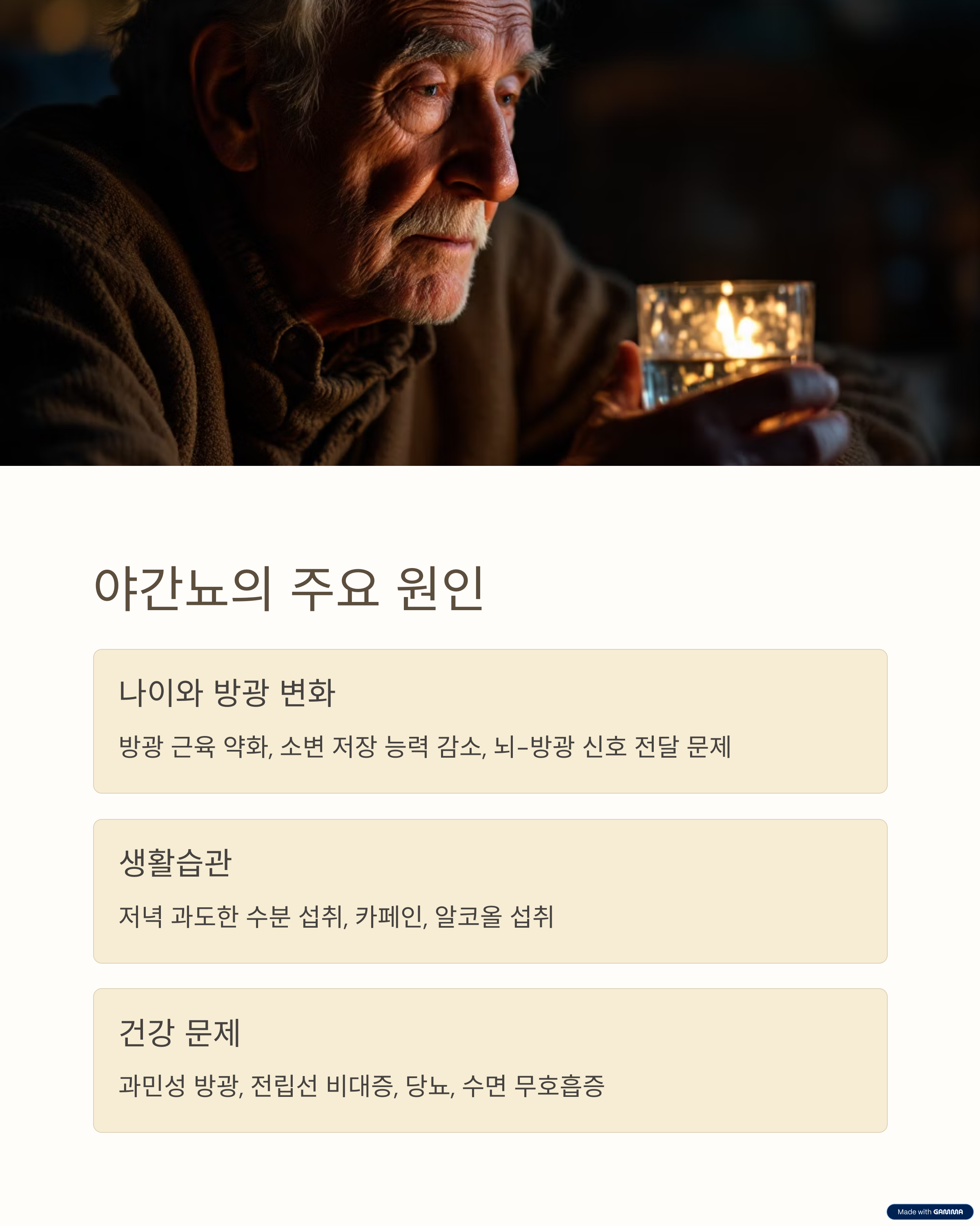 - 과민성 방광, 전립선 비대증, 당뇨, 수면 무호흡증 등 다양한 질환이 원인이 될 수 있습니다.