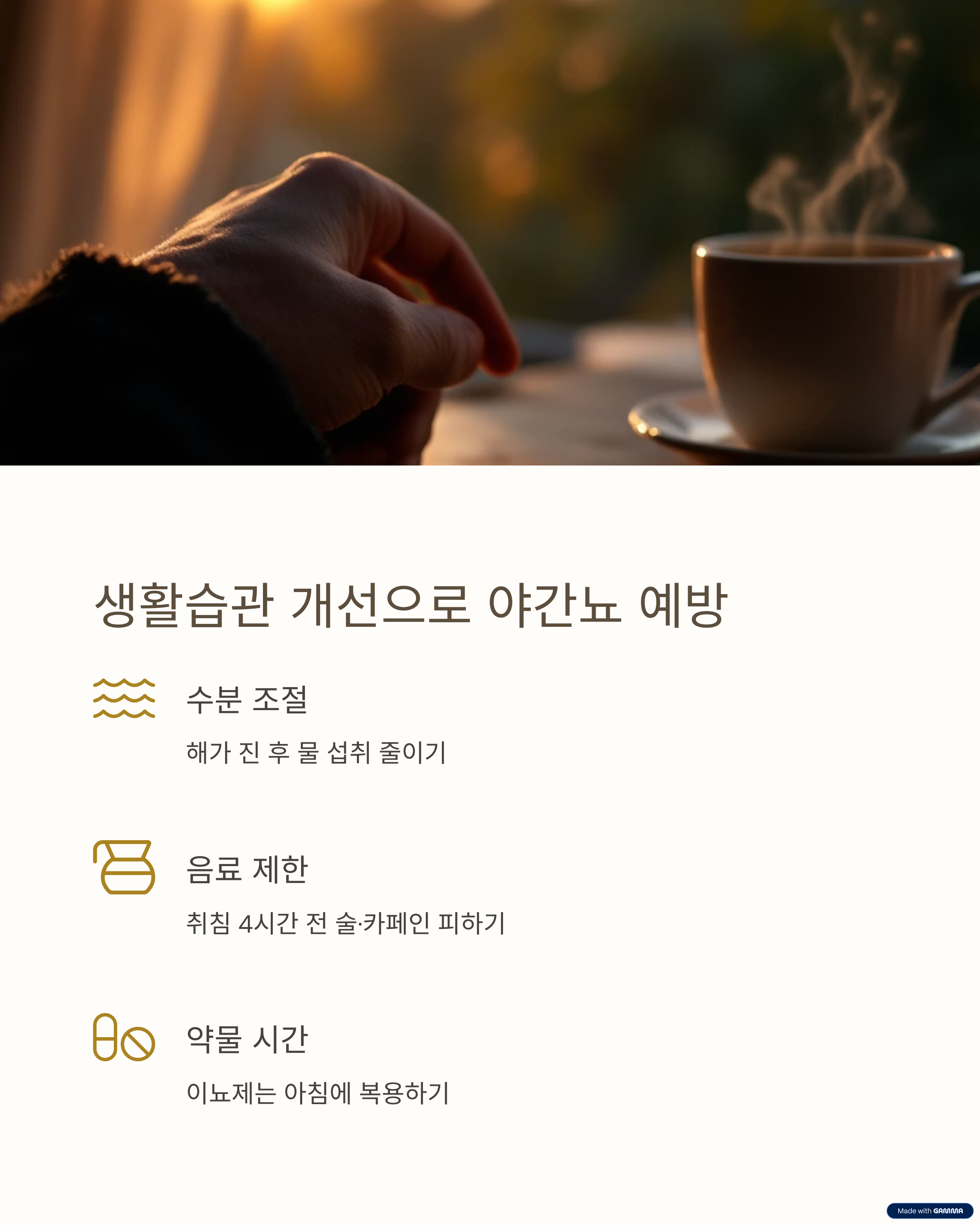 야간뇨, 방광 건강, 수면의 질, 과민성 방광, 전립선, 당뇨, 수면 무호흡증, 멜라토닌, 혈당, 카페인, 이뇨제, 다리 부종, 배뇨 훈련, 이중 배뇨법, 방광 근육, 신호 조절, 수분 섭취, 허벅지 운동, 혈당 체크, 수면 환경, 조격, 햇빛 노출