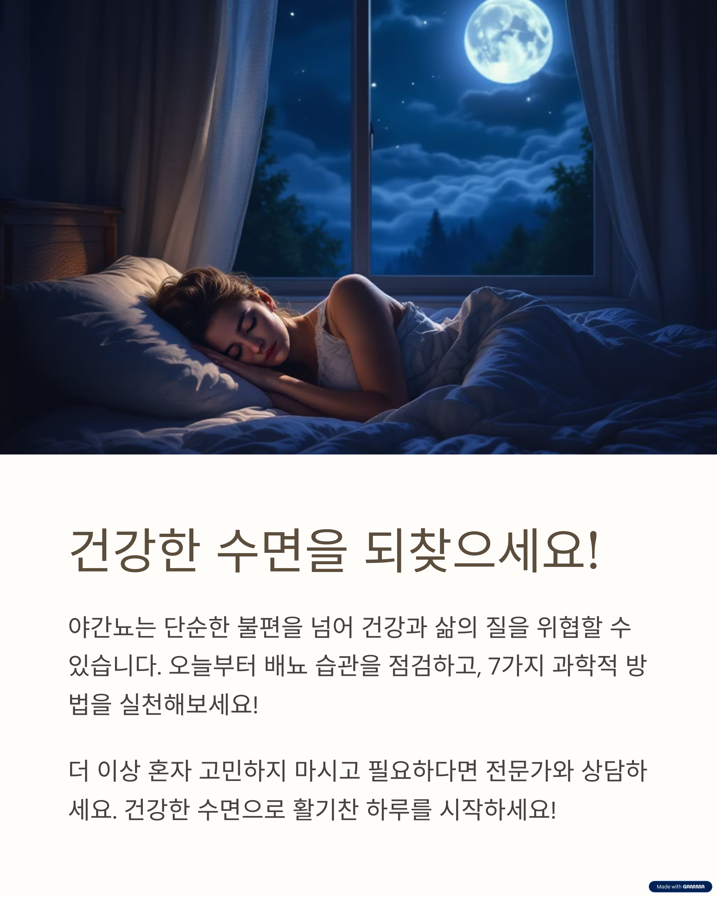 야간뇨는 단순한 불편을 넘어 건강과 삶의 질을 위협할 수 있습니다. 오늘부터 실천 가능한 과학적 방법으로 밤에 소변 때문에 잠에서 깨우는 야간뇨를 극복하고, 건강한 수면을 되찾으세요!