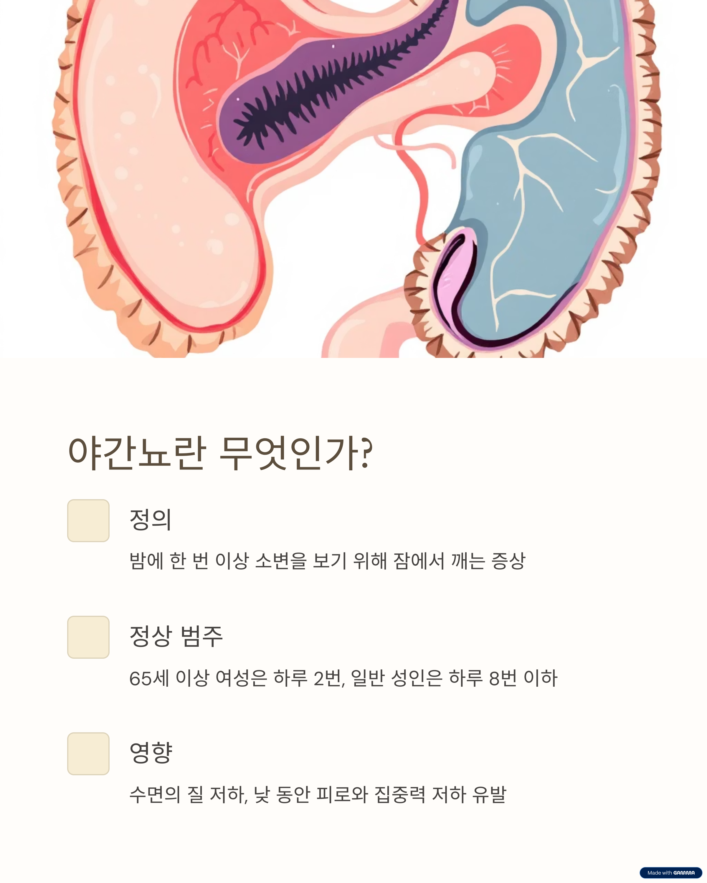 - 야간뇨란 밤에 한 번 이상 소변을 보기 위해 잠에서 깨는 증상을 말합니다.