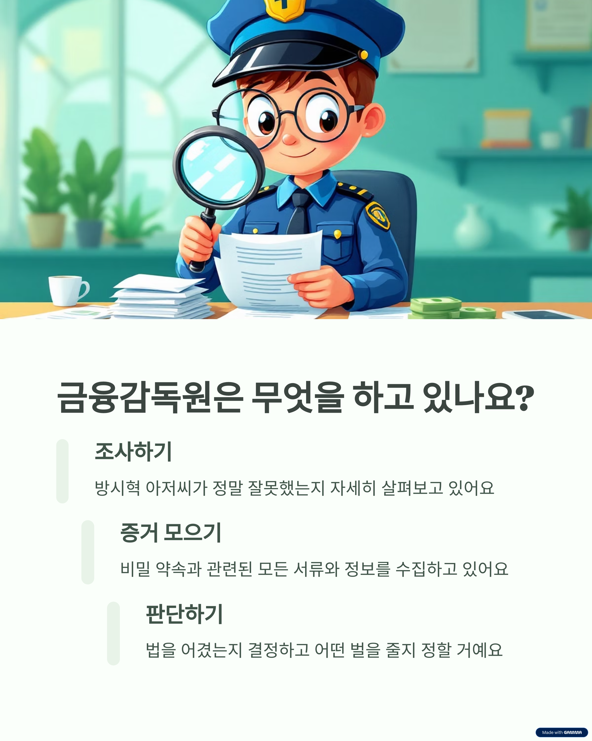 그래서 지금 **금융감독원(금융 경찰 같은 곳)**에서 조사 중이야.