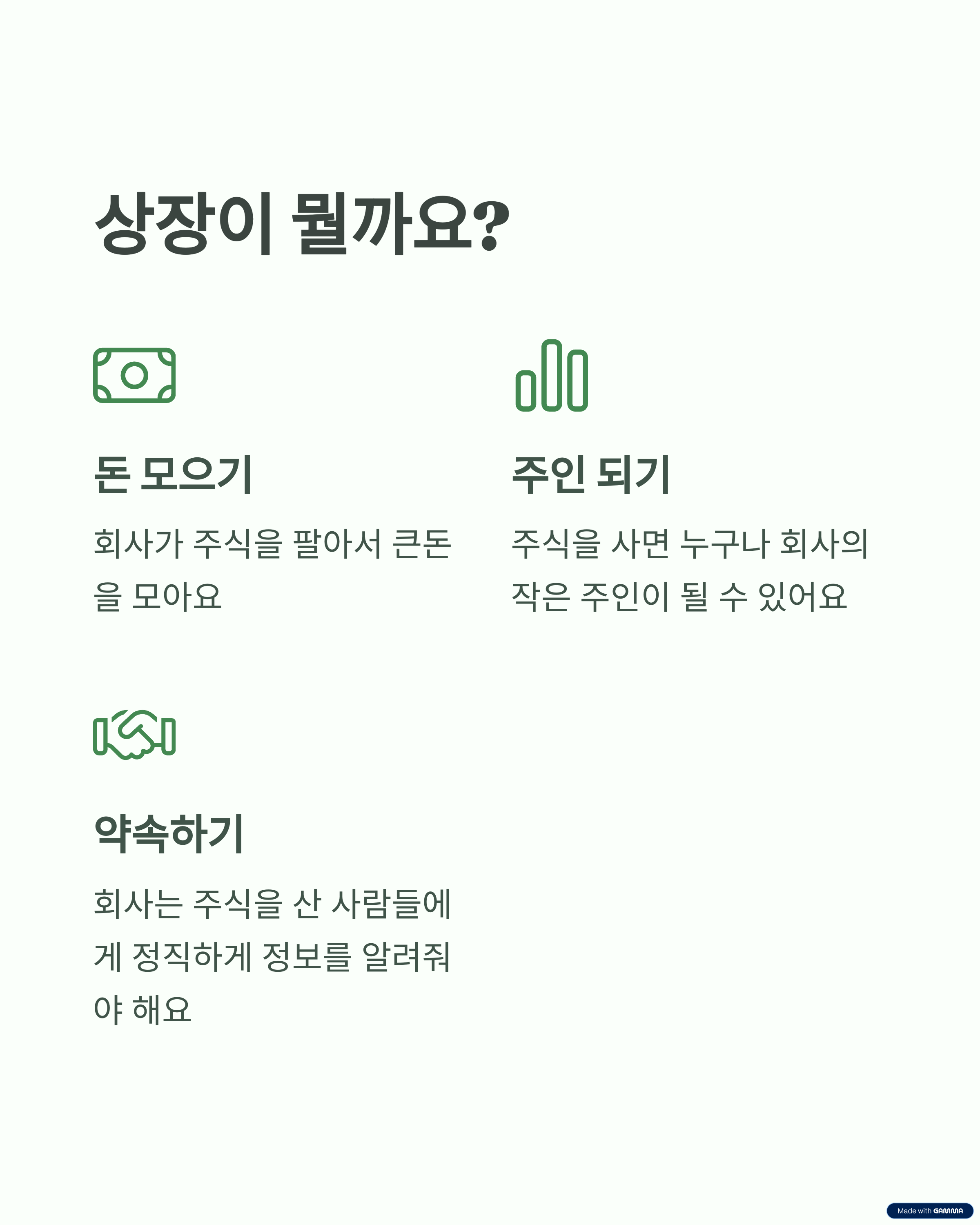 회사들이 돈을 더 많이 모으기 위해 주식을 팔아서 돈을 받는 일을 "상장"이라고 해.