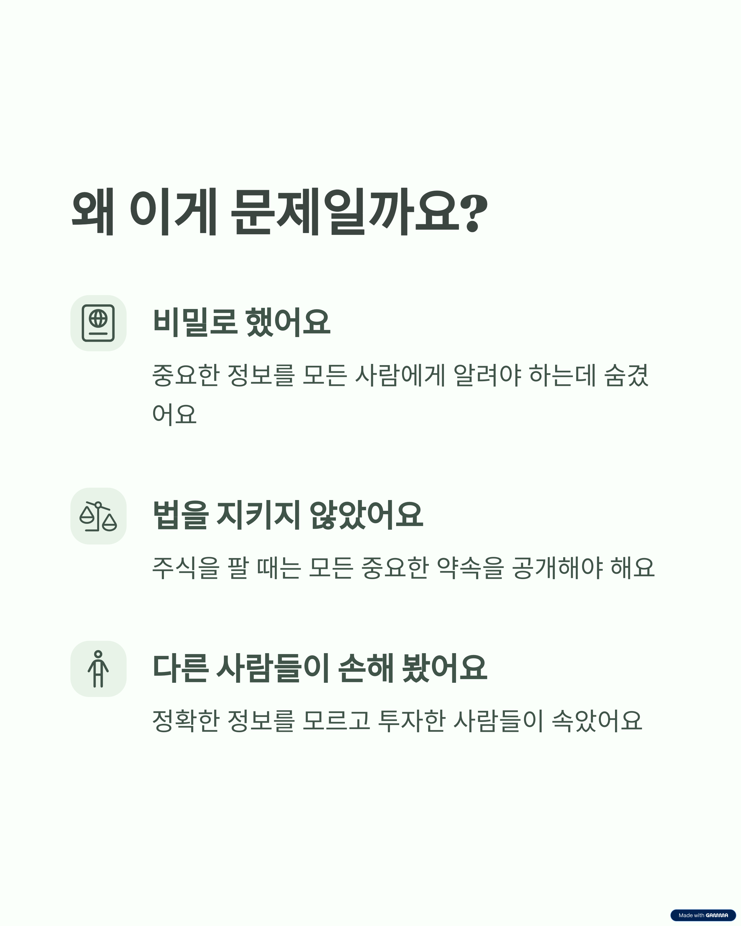 하지만 방 아저씨는 그걸 숨겨서, 사람들이 정확한 정보를 모르고 투자하게 만든 거야.