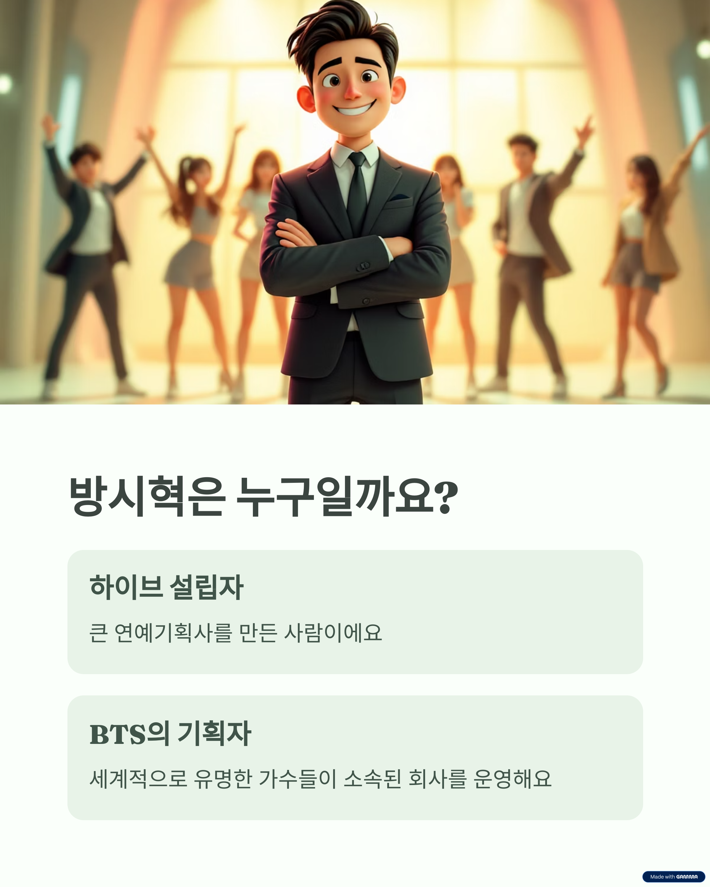 방시혁 아저씨는 하이브라는 큰 연예기획사를 만든 사람이야. 이 회사에는 BTS 같은 유명한 가수들이 소속되어 있어서 사람들이 아주 많이 관심을 가져.