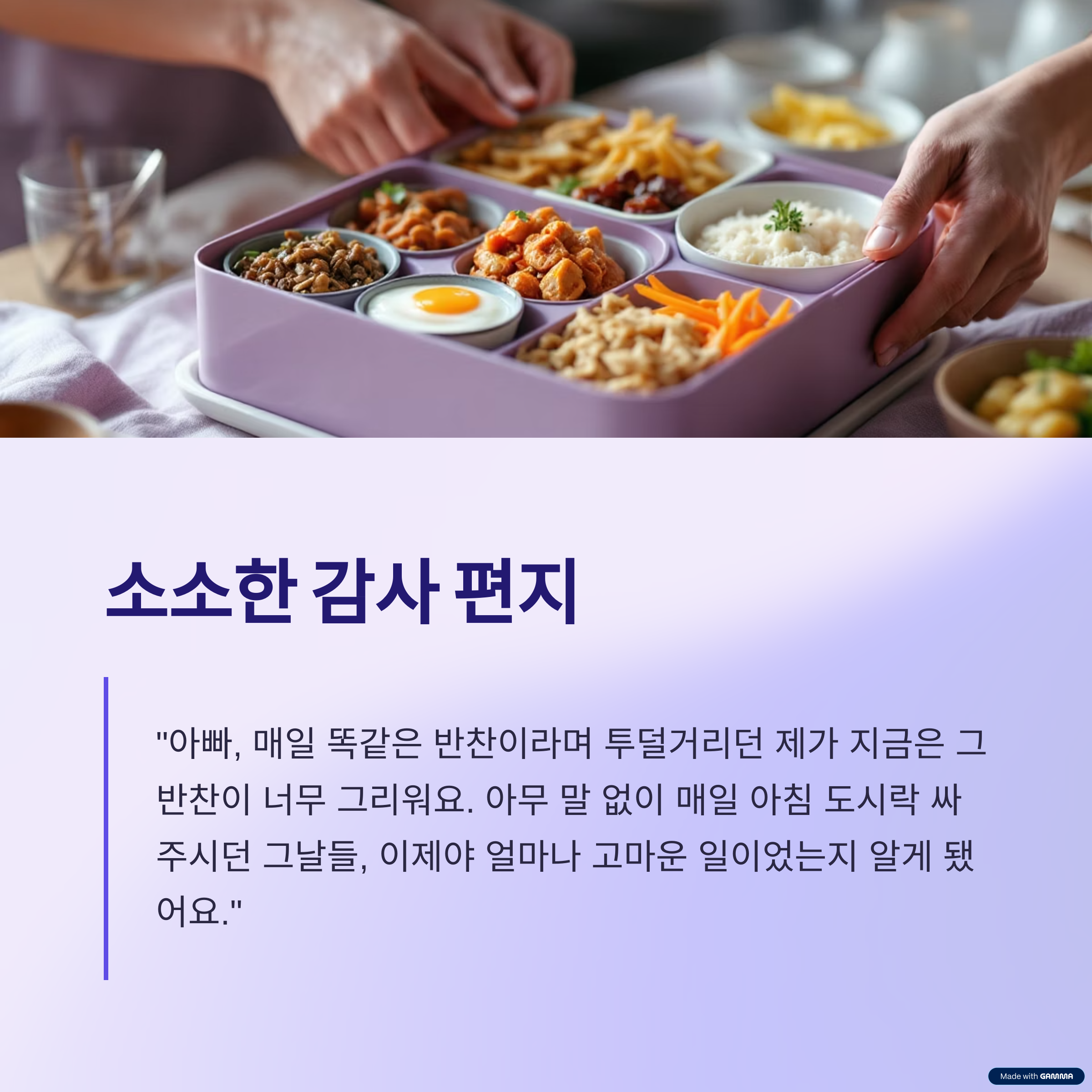 | 감사 표현형 | 일상의 수고에 대한 인지와 존중 | 반찬, 도시락, 말 없는 배려 |