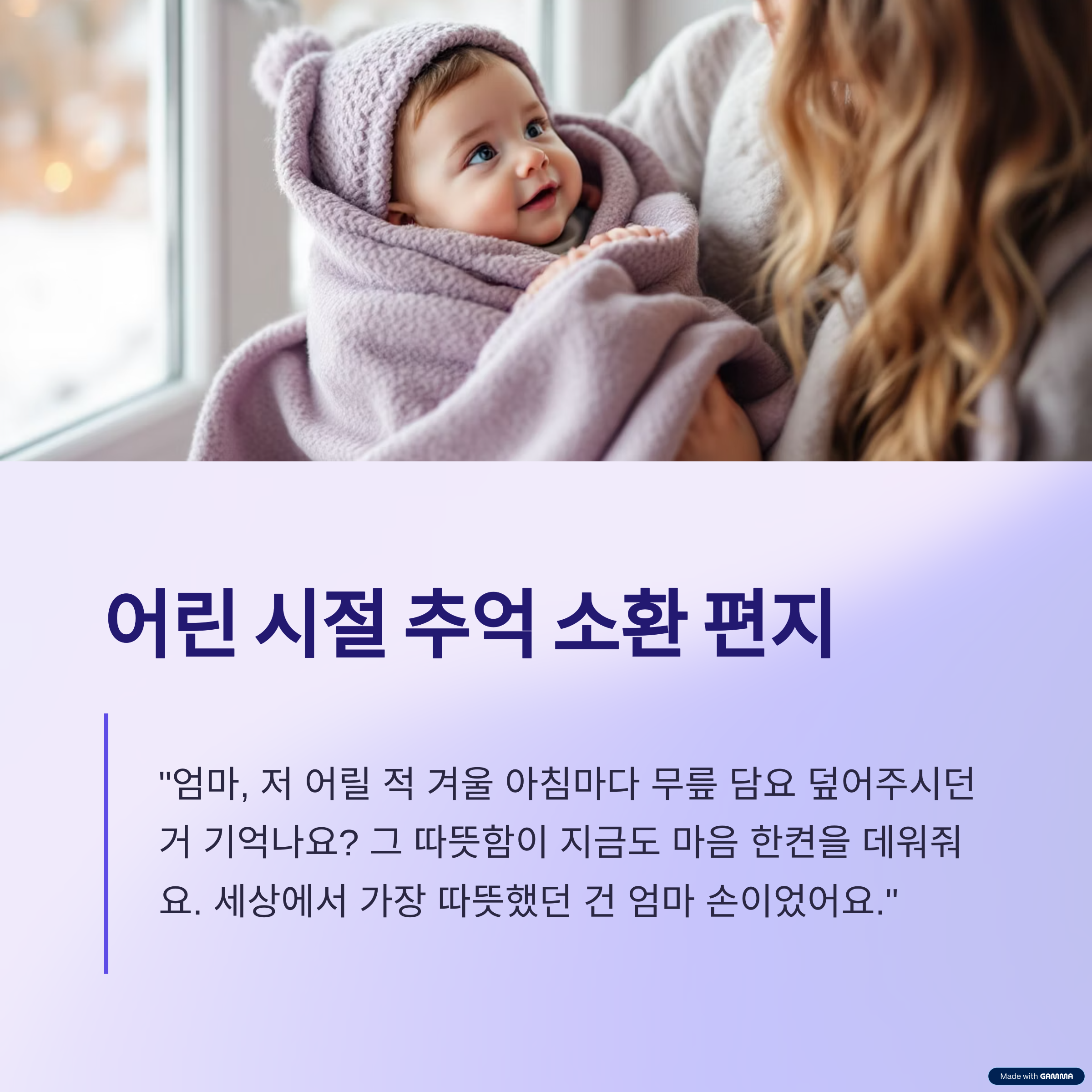 | 추억 회상형 | 과거 기억 언급, 구체적 장면 묘사 | 어린 시절, 도시락, 담요 |