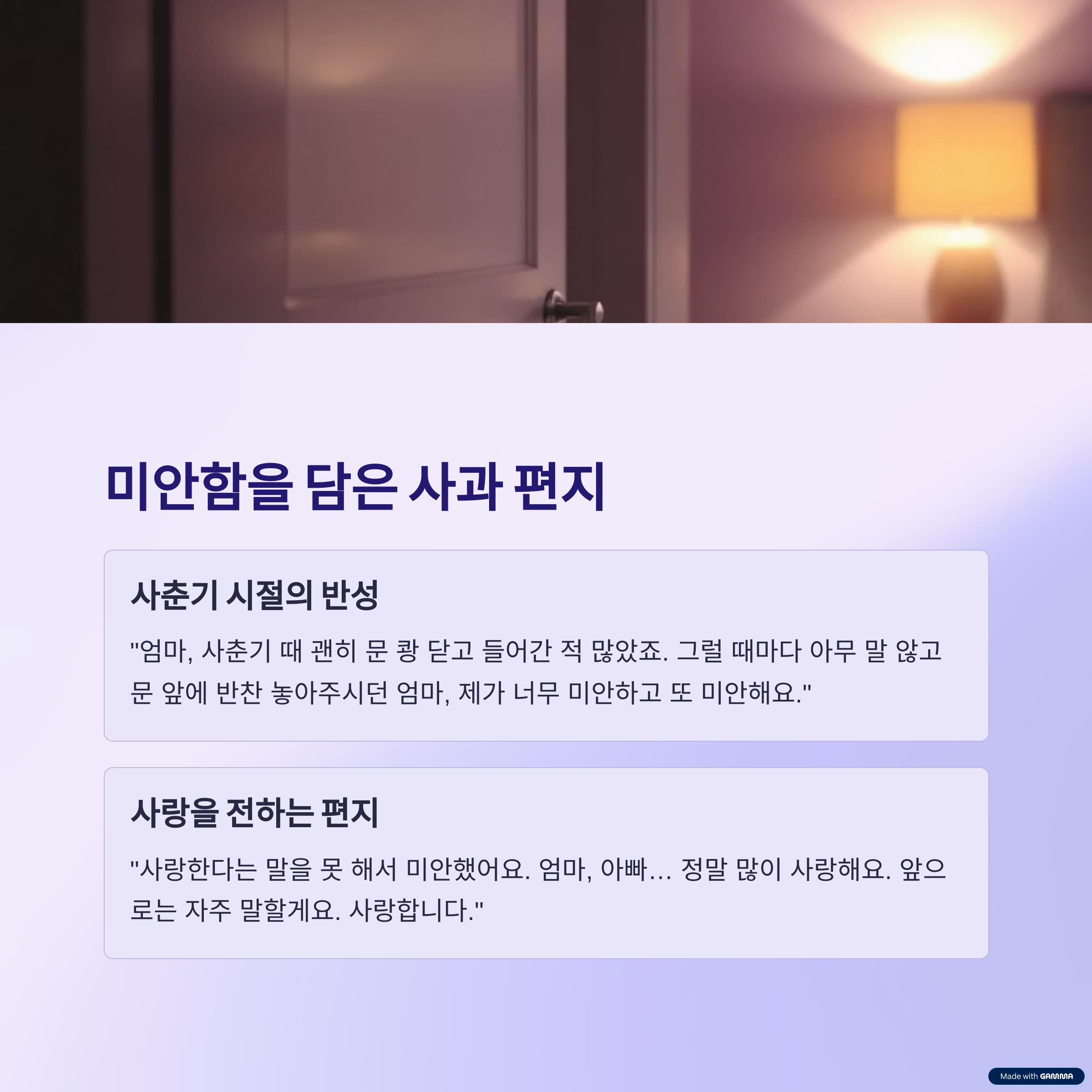 | 미안함 고백형 | 사춘기, 상처 준 행동에 대한 반성 | 사과, 후회, 미안함 |