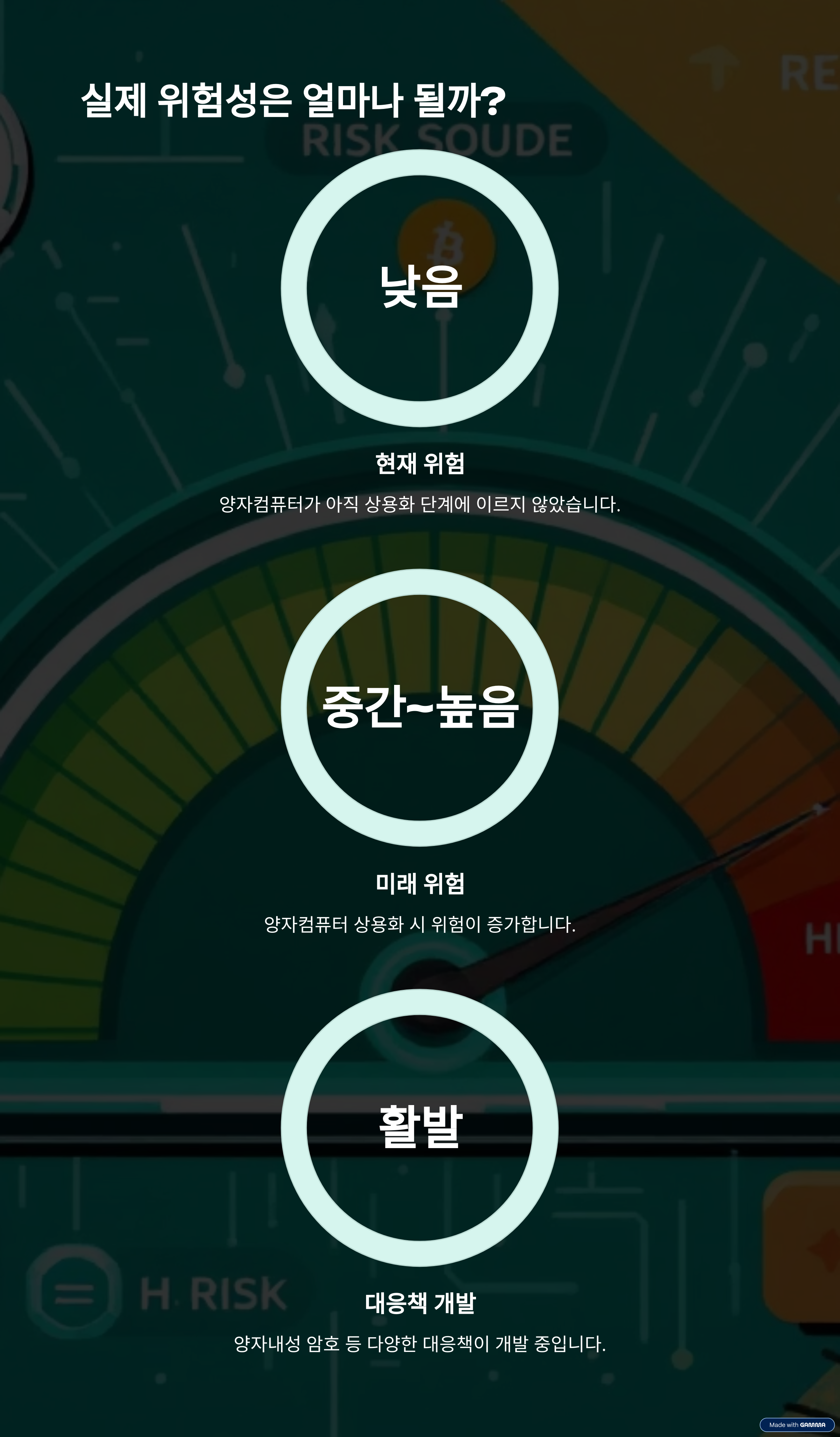 - 현재 위험: 낮음 (양자컴퓨터 상용화 전)