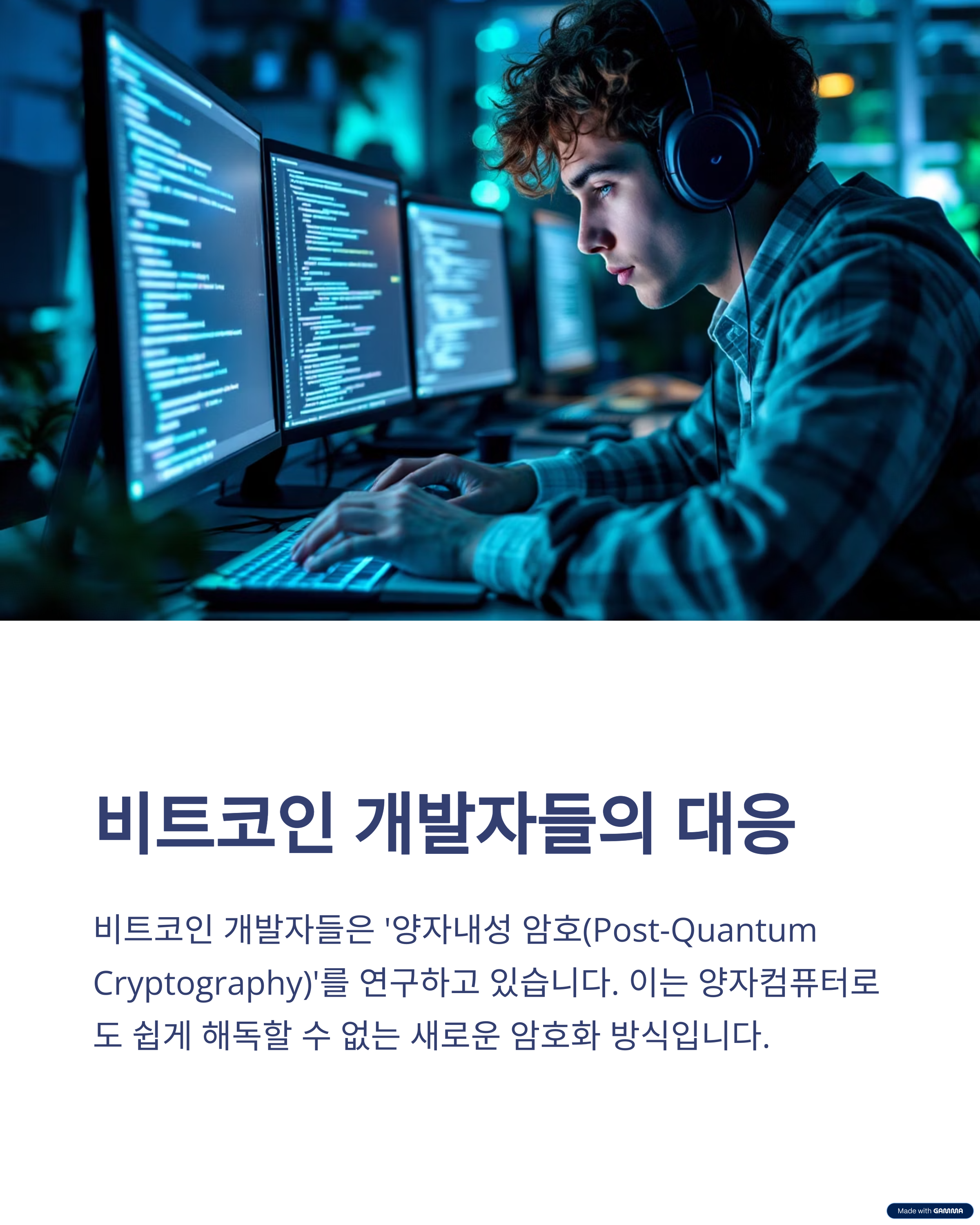 - 비트코인 개발자들은 양자컴퓨터 위협에 대응하기 위해 '양자내성 암호(Post-Quantum Cryptography)'를 연구하고 있습니다.