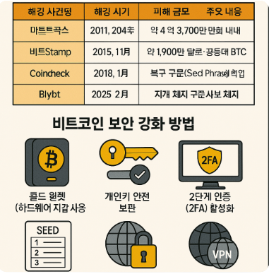 | 마운트곡스(Mt. Gox) | 2011, 2014년 | 약 4억 3,700만 달러 | 세계 최대 거래소였으나, 두 차례 해킹으로 파산. 핫 월렛(온라인 지갑)에서 대량 비트코인 탈취. |