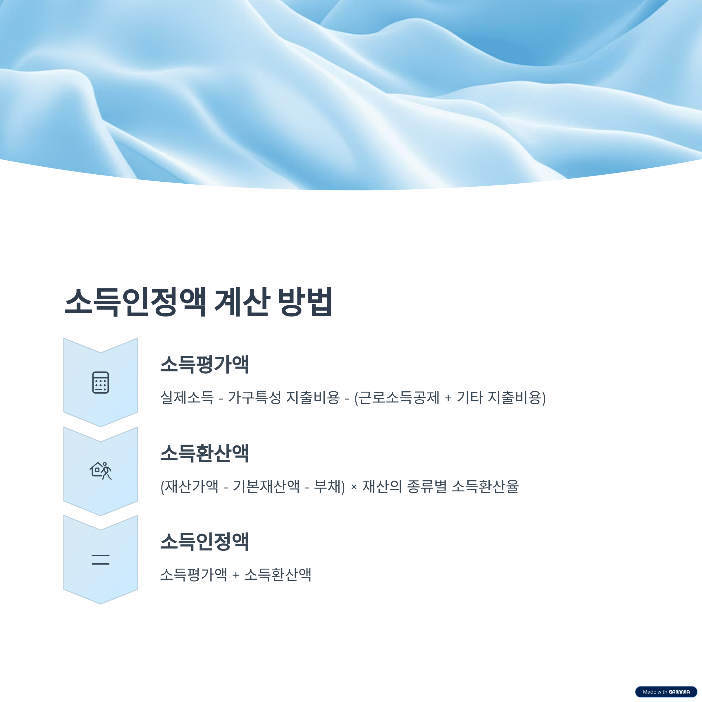 | 소득환산액 | {(재산의 종류별 가액 - 기본재산액 - 부채)} × 재산의 종류별 소득환산율 |