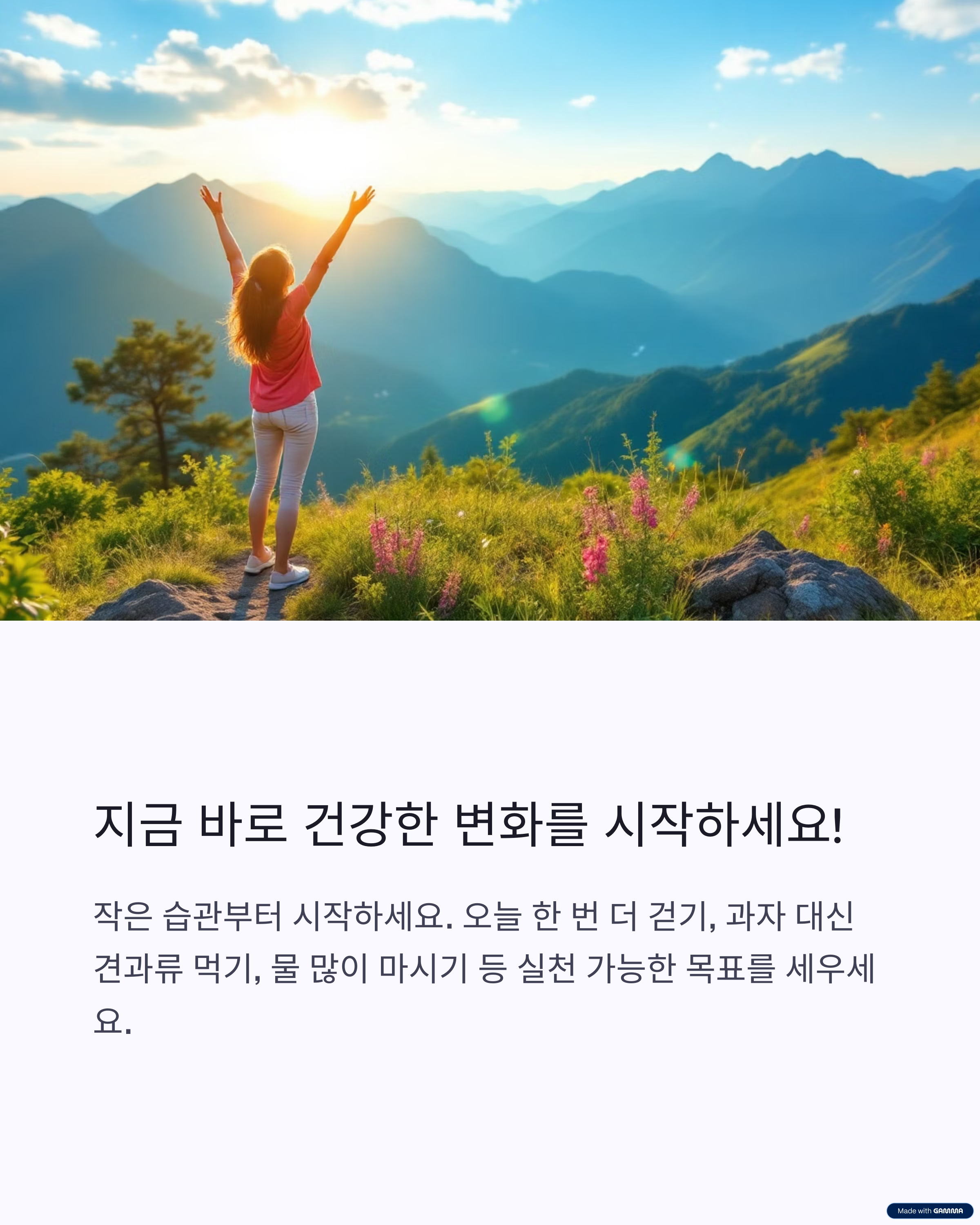 - 작은 습관부터 시작하세요. 오늘 한 번 더 걷기, 과자 대신 견과류 먹기, 물 많이 마시기 등 실천 가능한 목표를 세우세요.