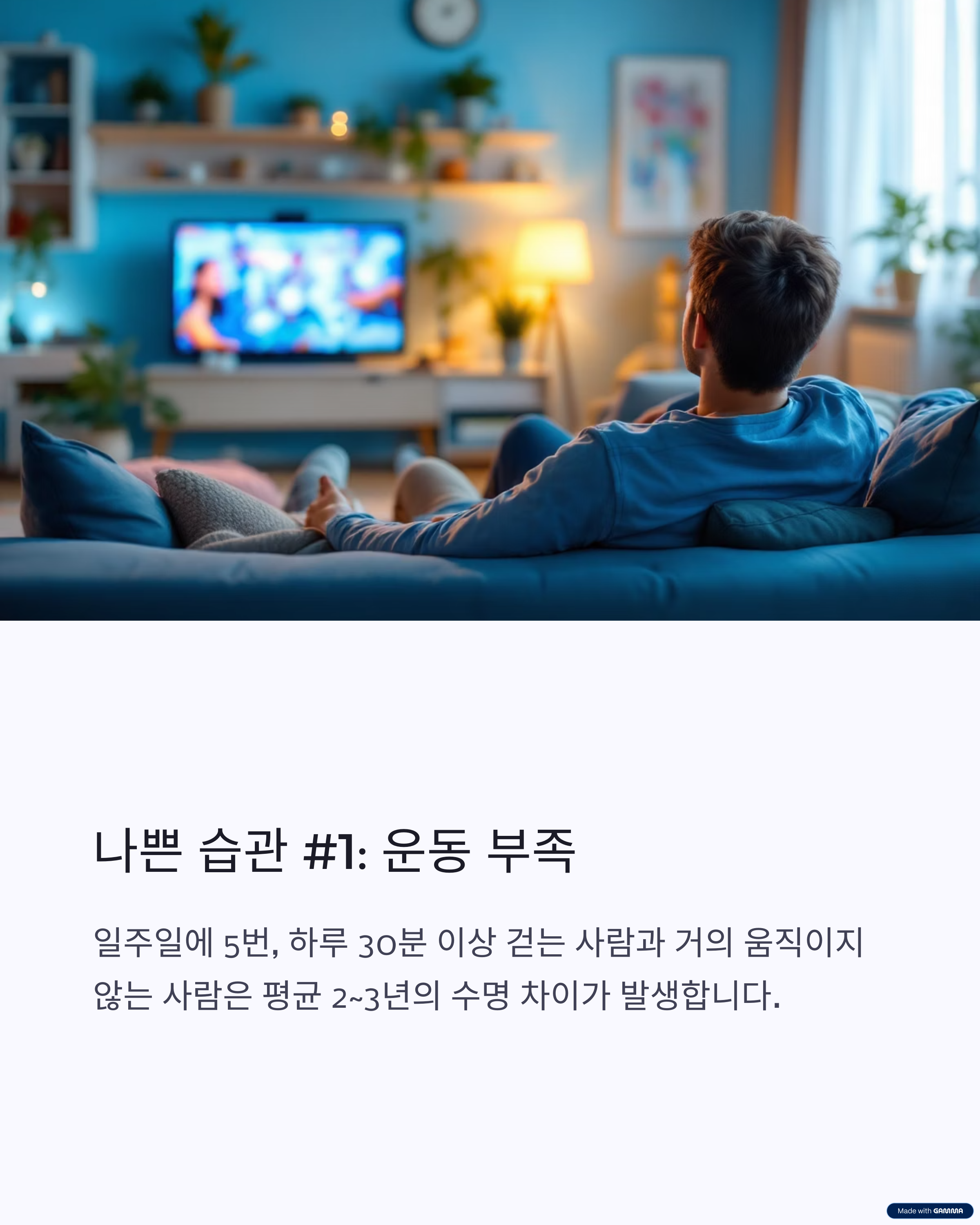 - 운동 부족은 대표적인 수명을 단축시키는 나쁜 생활 습관입니다.