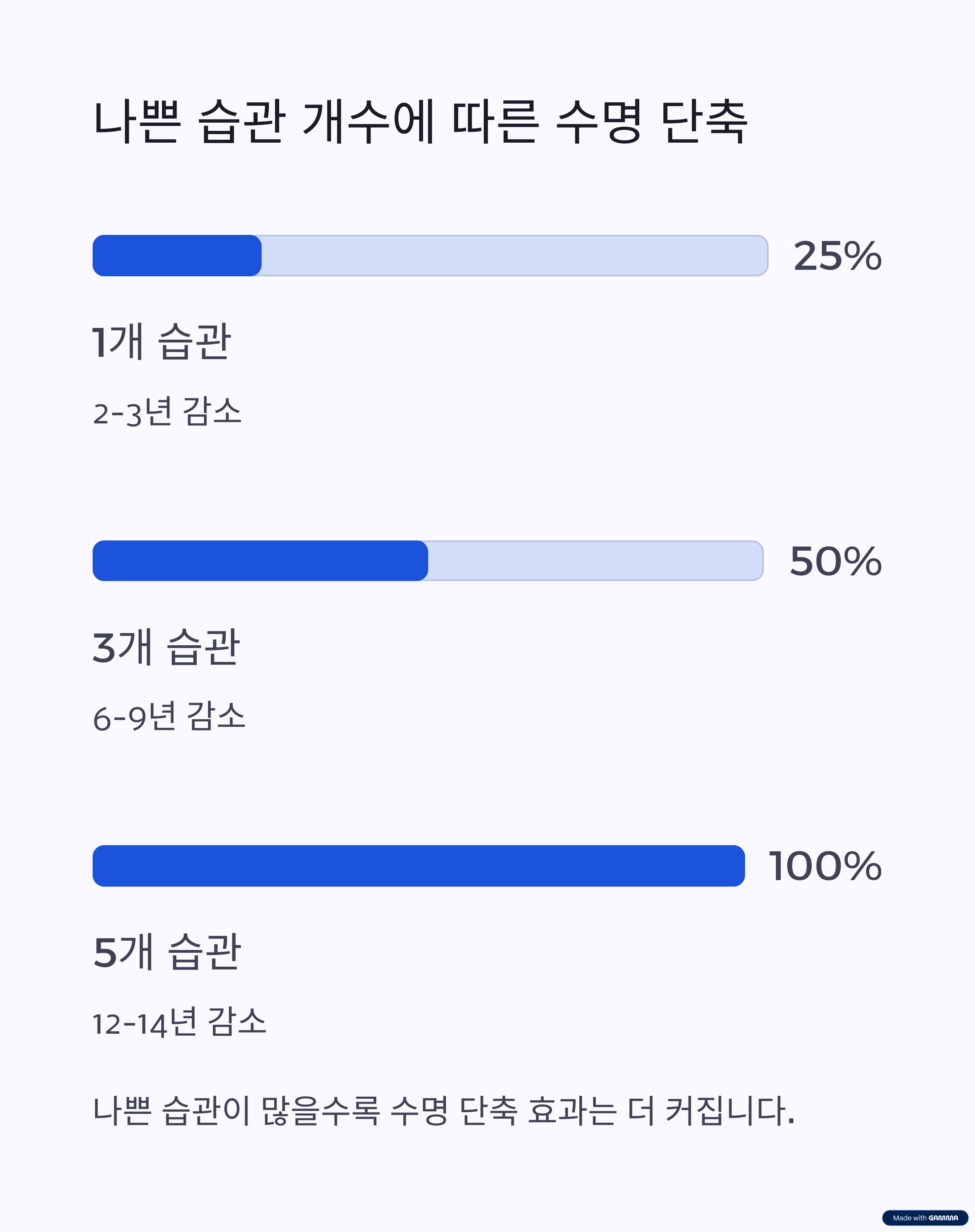 - 여러 나쁜 습관이 복합적으로 작용할 때 수명 단축 효과는 더욱 커집니다.