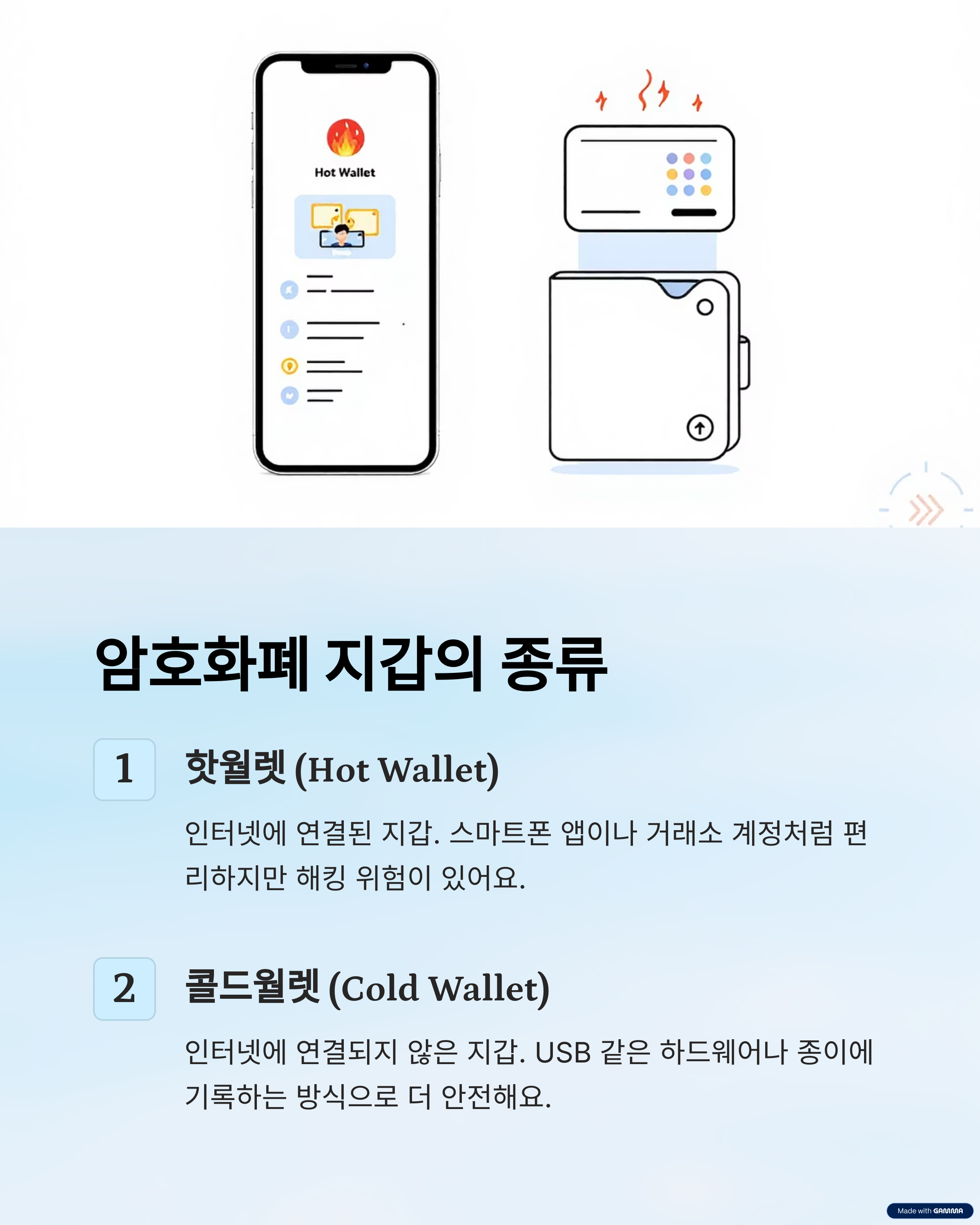 핫월렛은 인터넷에 연결되어 편리하지만 해킹 위험이 있고, 콜드월렛은 인터넷에 연결되지 않아 더 안전해요.