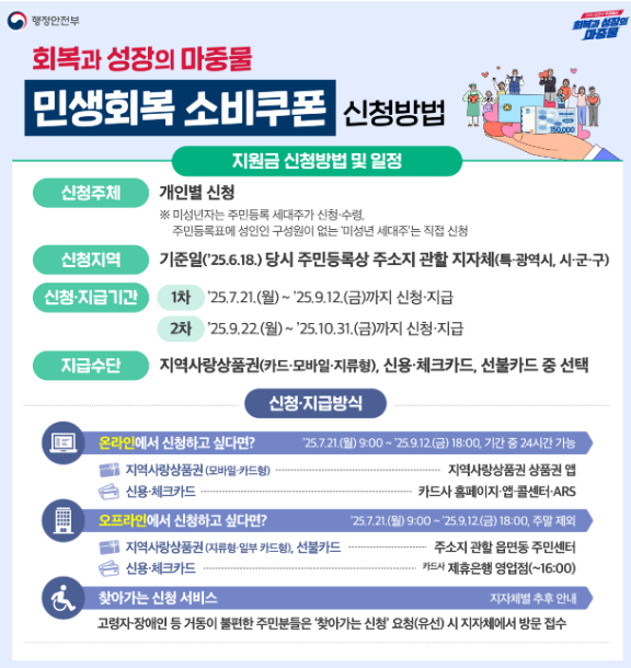 - 쿠폰은 신용·체크카드나 지역사랑상품권(모바일, 카드, 종이형) 형태로 지급됩니다.