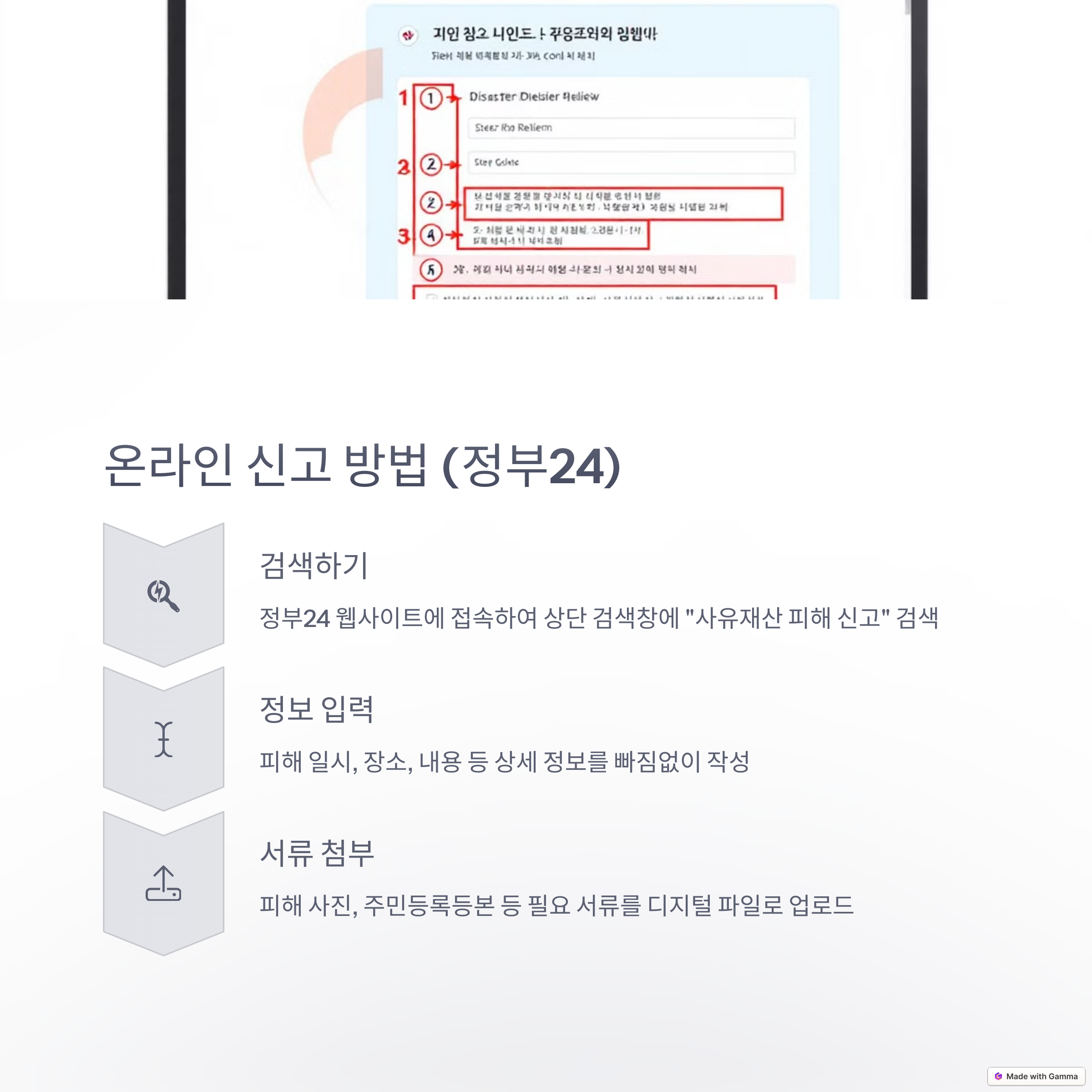 - 인터넷: 정부24(www.gov.kr)에서 "사유재산 피해 신고" 메뉴를 통해 온라인 신청 가능