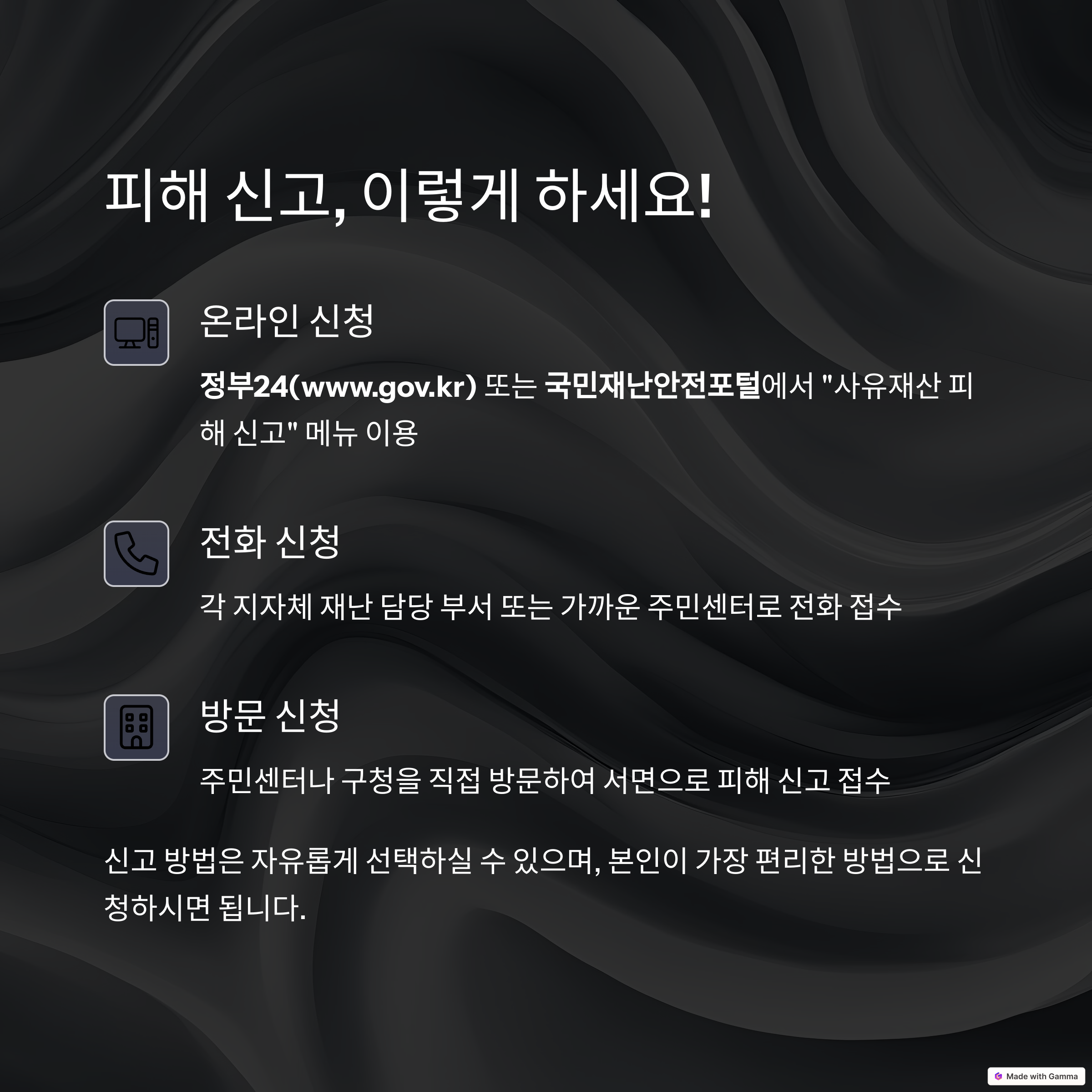 - 인터넷: 국민재난안전포털에서 피해 신고 및 보상 신청 가능