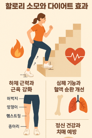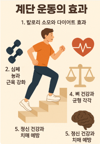 - 계단을 오르면 심장이 빨리 뛰고, 온몸에 혈액이 잘 돌게 됩니다. 이로 인해 심장과 폐가 튼튼해지고, 심혈관 질환 예방에 효과적입니다