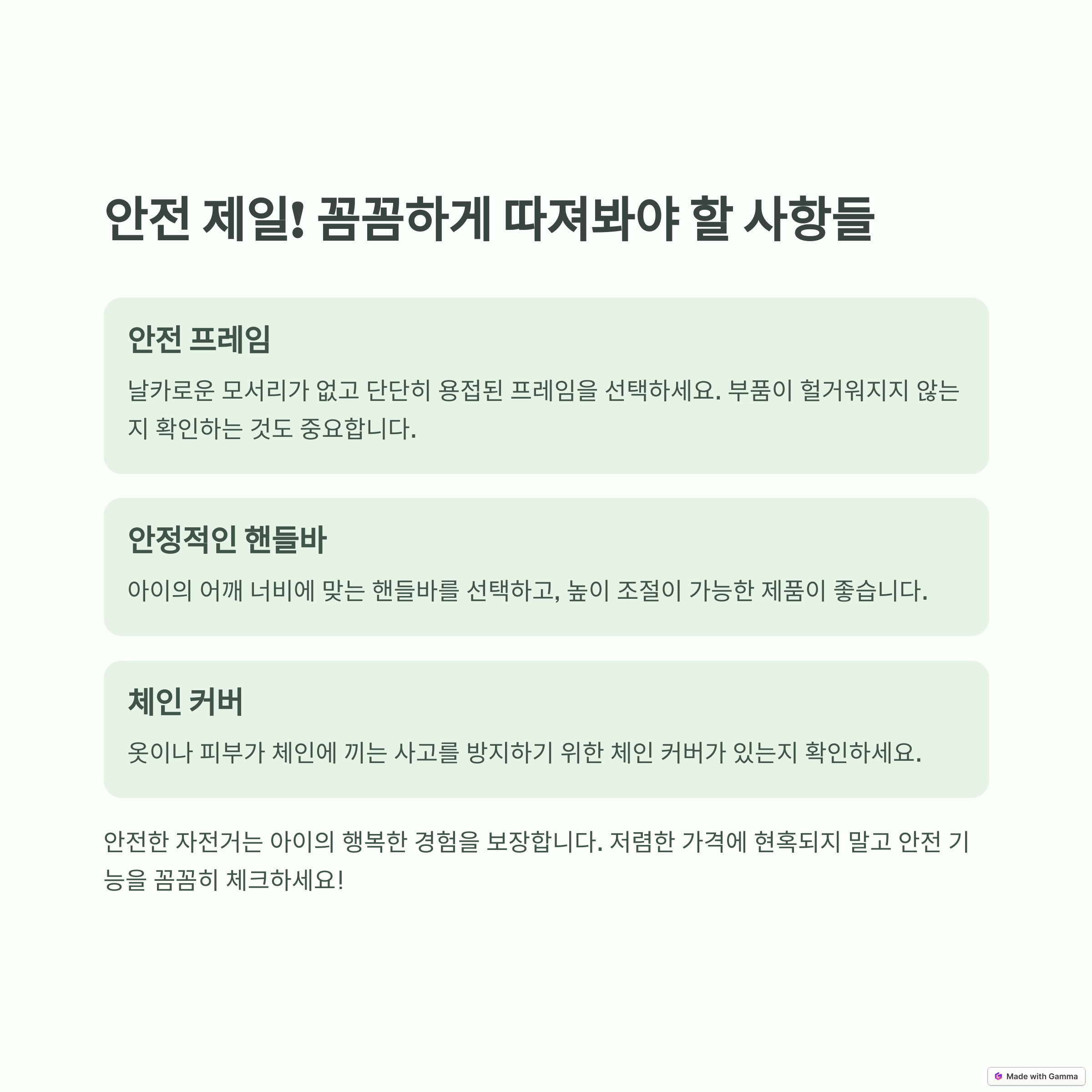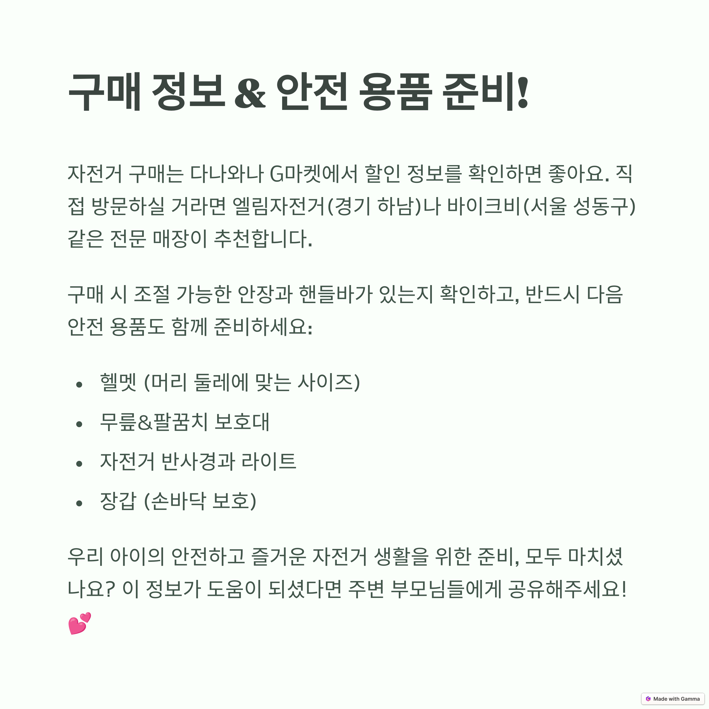 - 유지보수가 간편한 모델을 고르고, 안전 용품(헬멧, 보호대)을 함께 준비하세요.