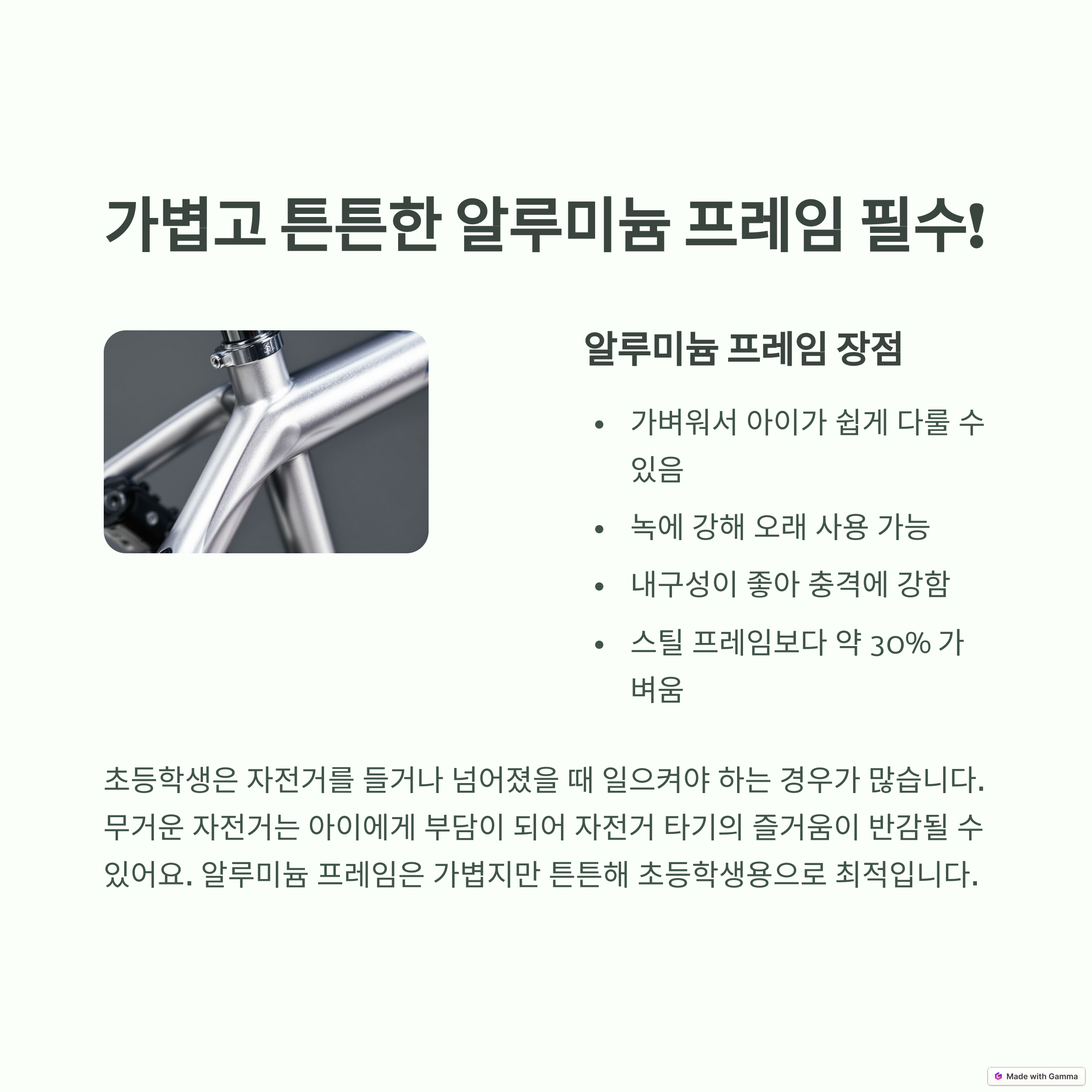 - 프레임 소재: 가벼운 알루미늄 소재가 아이들이 다루기 쉽습니다