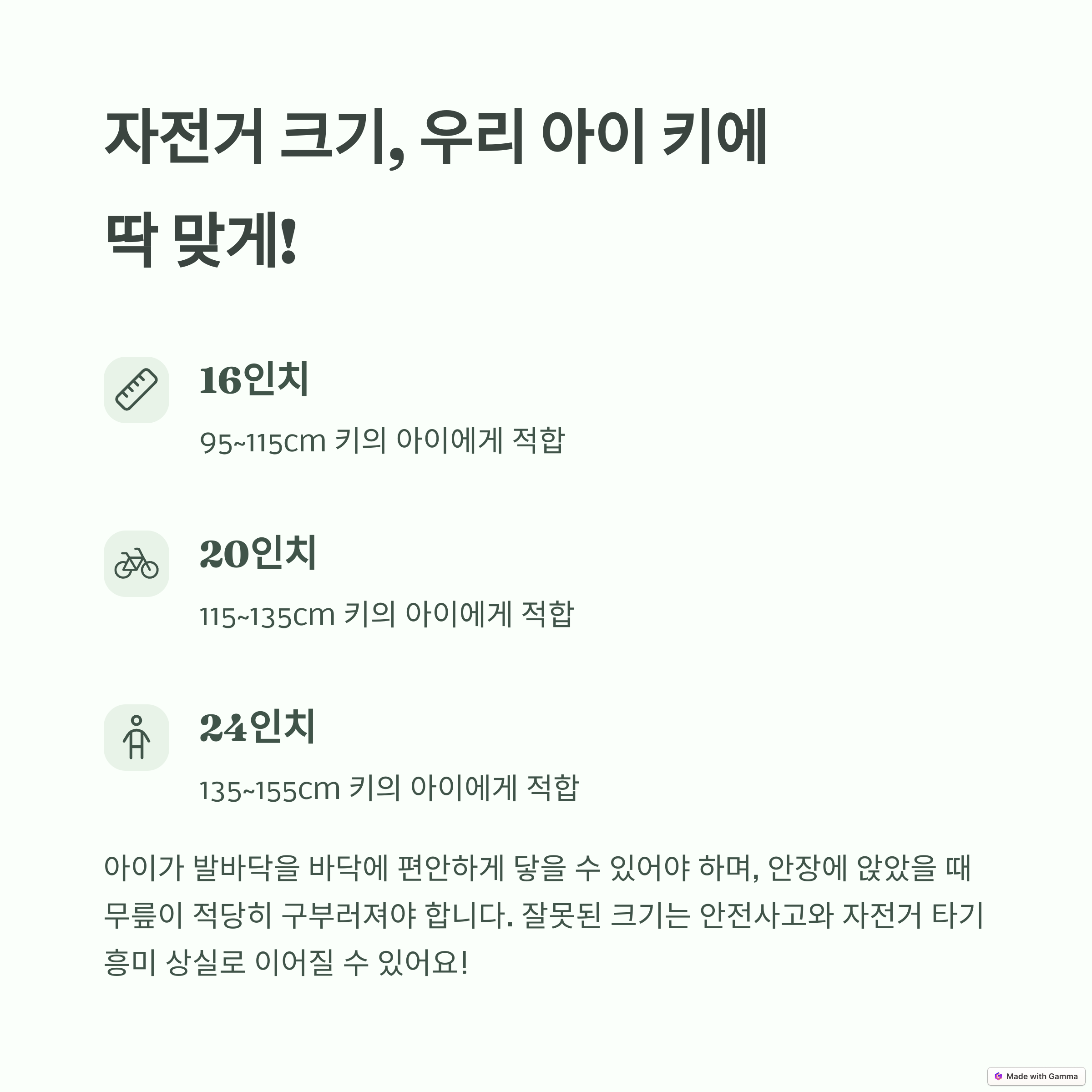- 자전거 크기는 아이의 키와 신장에 따라 결정됩니다.