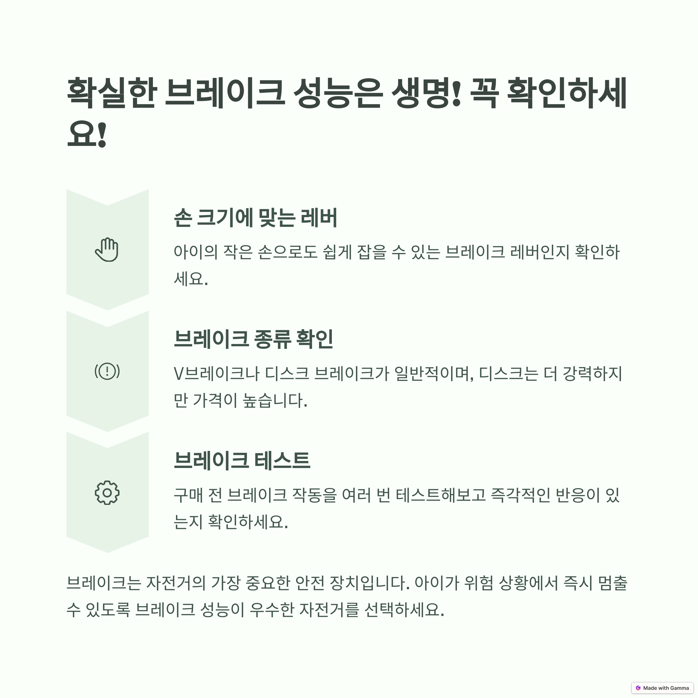 - 브레이크 성능: 제동력이 우수한 브레이크를 확인하세요