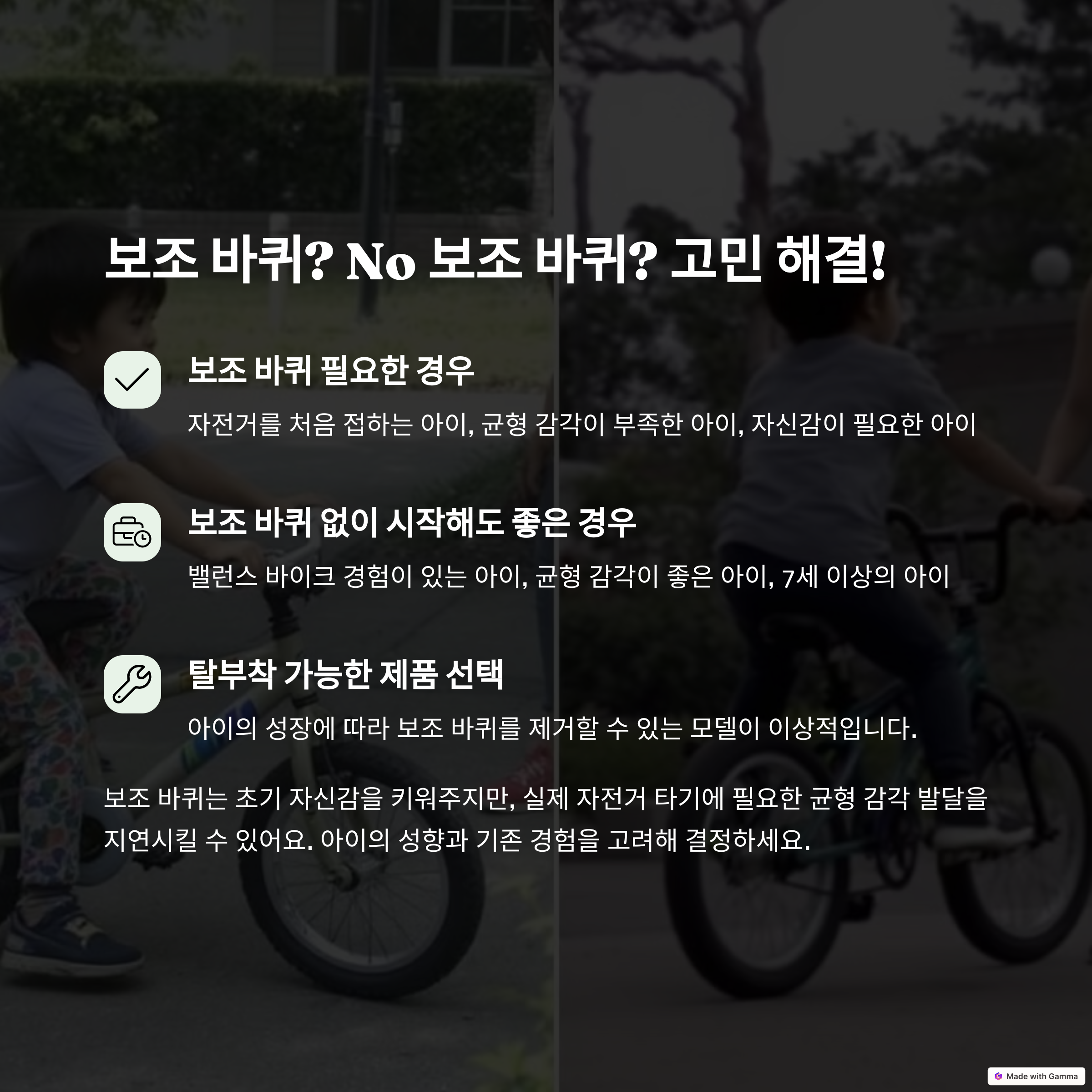 - 보조 바퀴: 초보자라면 보조 바퀴가 있는 모델을 선택하세요.
