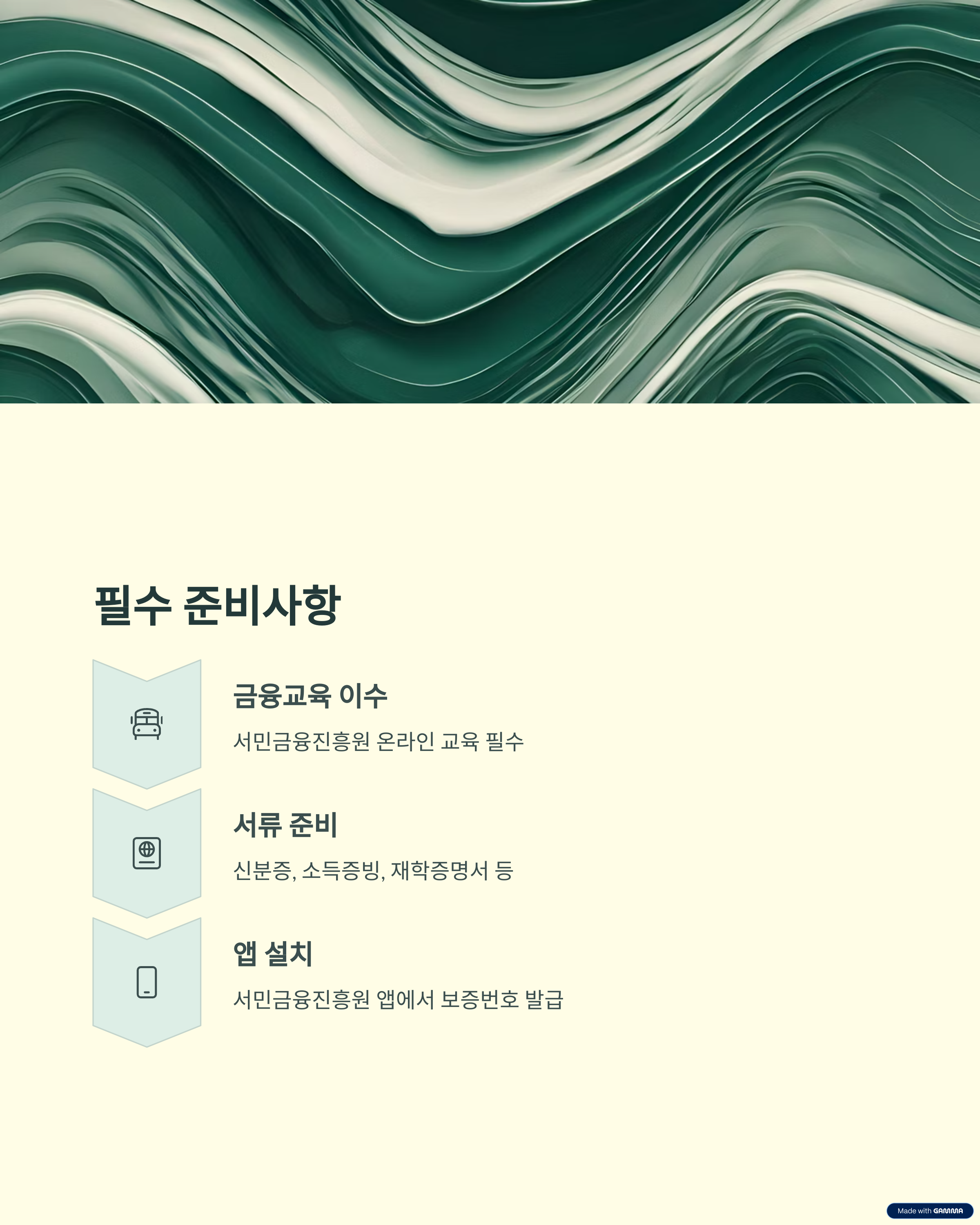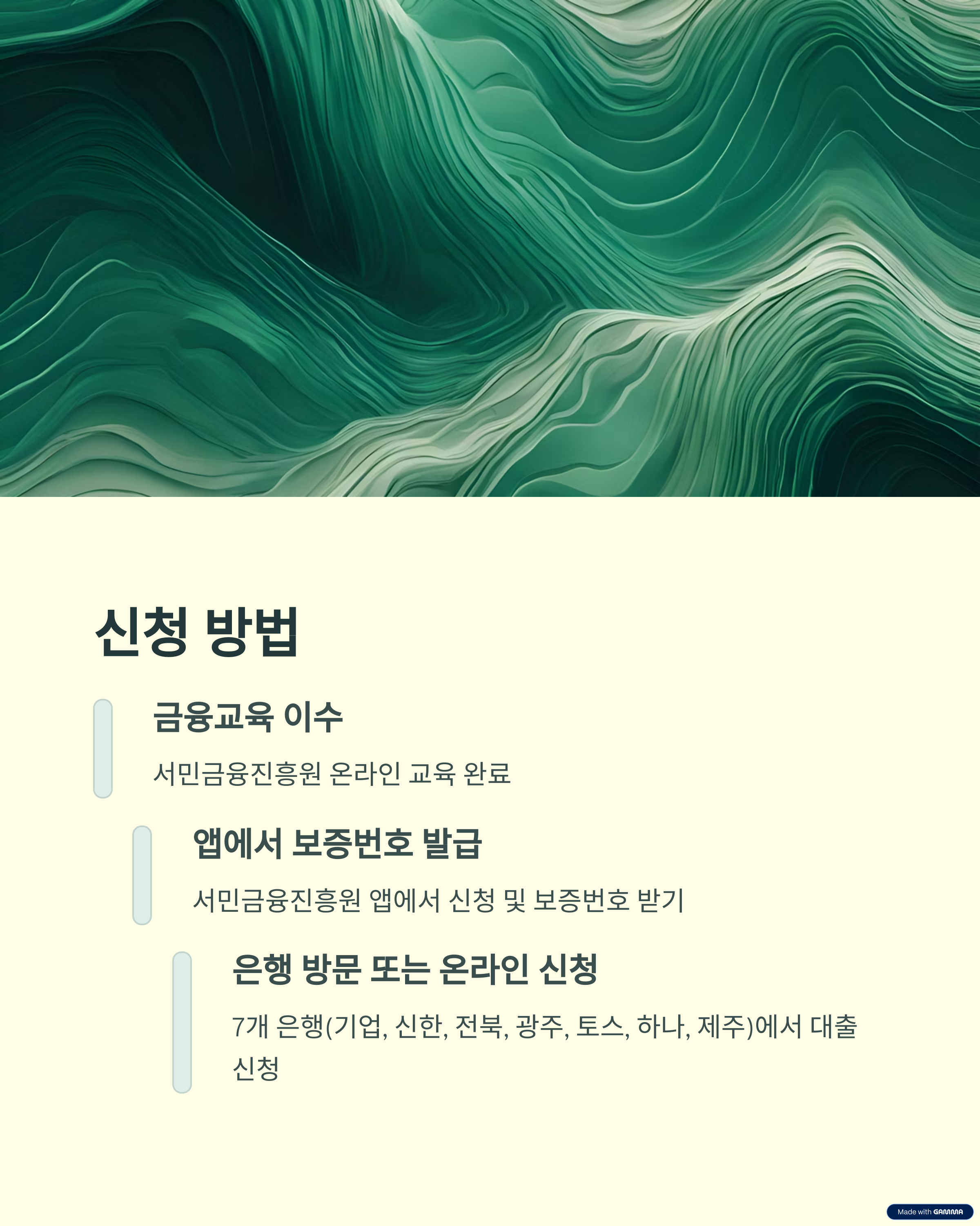- 신청 방법: 서민금융진흥원 앱에서 보증번호 발급 → 은행(기업, 신한, 전북, 광주, 토스, 하나, 제주)에서 대출 신청