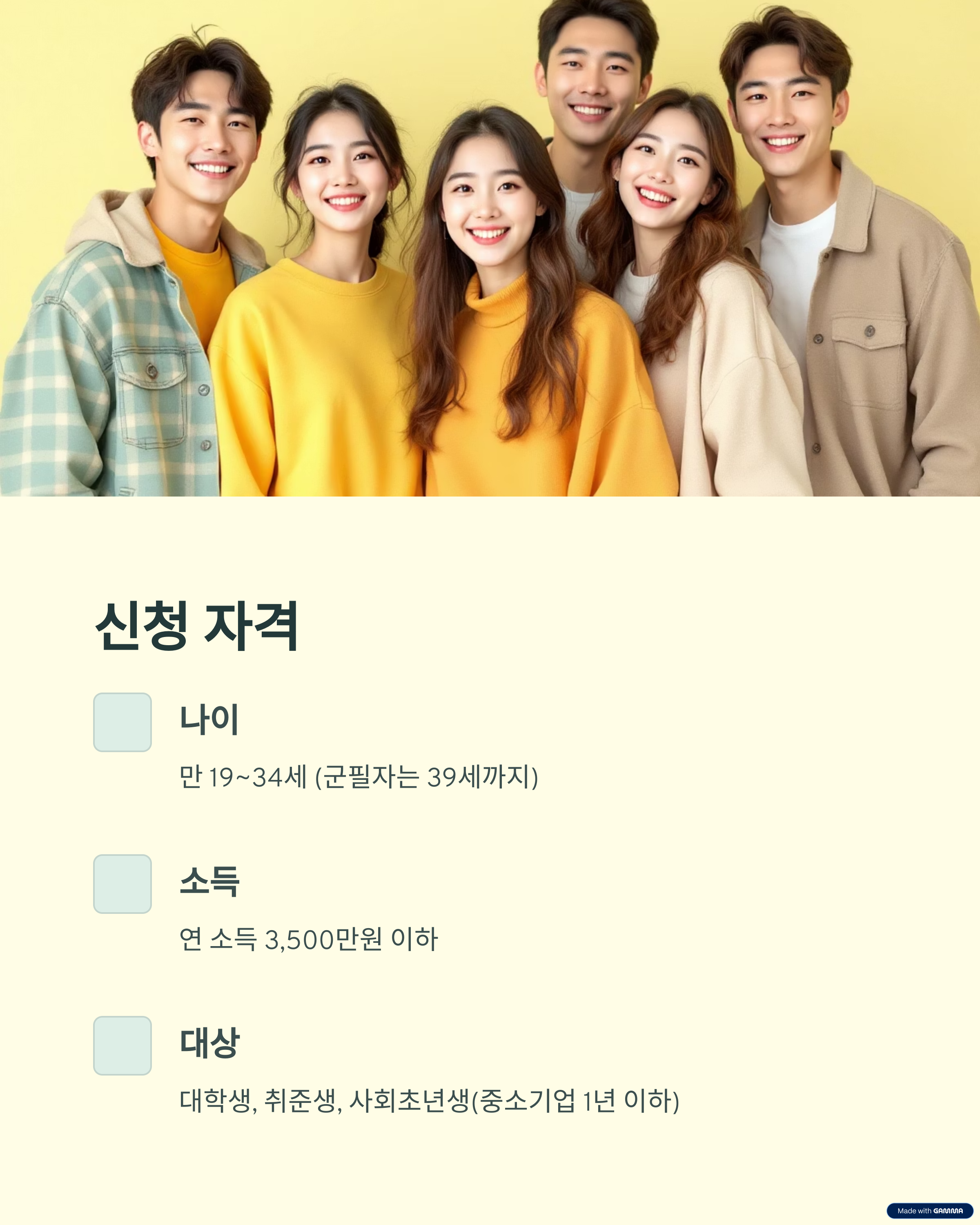 - 나이: 만 19세 이상 만 34세 이하(군대 다녀온 사람은 만 39세까지 가능)